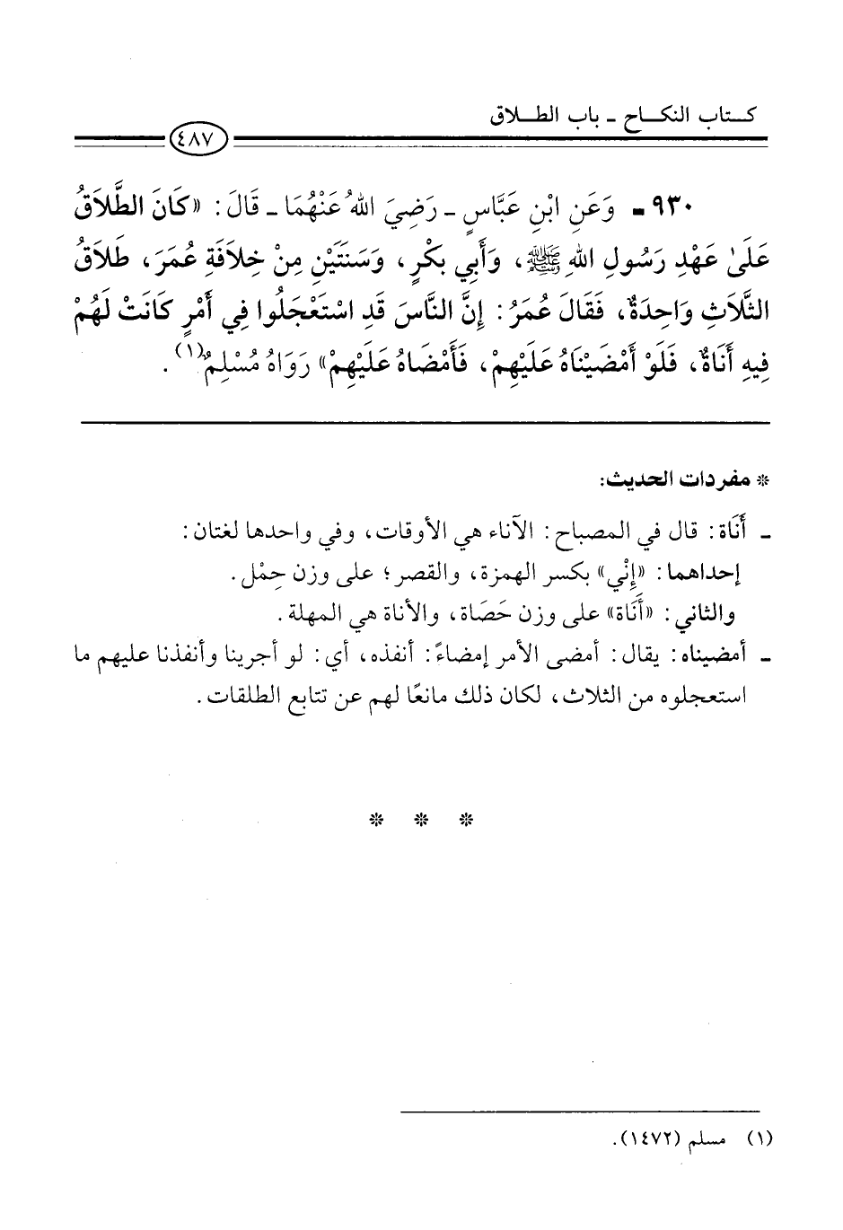 930 - وَعَنِ ابْنِ عَبَّاسٍ -رَضِيَ اللهُ عَنْهُمَا- قَالَ: "كَانَ الطَّلاَقُ عَلَى عَهْدِ رَسُولِ اللهِ -صلى الله عليه وسلم-، وَأَبِي بكْرٍ، وَسَنَتَيْنِ مِنْ خِلاَفَةِ عُمَرَ، طَلاَقُ الثَّلاَثِ وَاحِدَةٌ، فَقَالَ عُمَرُ: إِنَّ النَّاسَ قَدِ اسْتَعْجَلُوا فِي أَمْرٍ كَانَتْ لَهُمْ فِيهِ أَنَاةٌ، فَلَوْ أَمْضَيْنَاهُ عَلَيْهِمْ، فَأَمْضَاهُ عَلَيْهِمْ" رَوَاهُ مُسْلِمٌ (¬1).