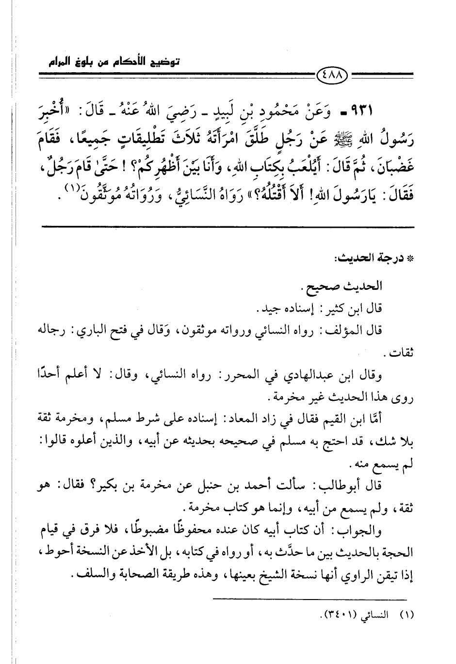 931 - وَعَنْ مَحْمُودِ بْنِ لَبِيدٍ -رَضِيَ اللهُ عَنْهُ- قَالَ: "أُخْبِرَ رَسُولُ اللهِ -صلى الله عليه وسلم- عَنْ رَجُلٍ طَلَّقَ امْرَأَتَهُ ثَلاَثَ تَطْلِيقَاتٍ جَمِيعًا، فَقَامَ غَضْبَانَ، ثُمَّ قَالَ: أَيُلْعَبُ بكِتَابِ اللهِ، وَأَنَا بَيْنَ أَظْهُرِكُمْ؟! حَتَّى قَامَ رَجُلٌ، فَقَالَ: يَارَسُولَ اللهِ! أَلاَ أَقْتُلُهُ؟ " رَوَاهُ النَّسَائِيُّ، وَرُوَاتُهُ مُوثَّقُونَ (¬1).