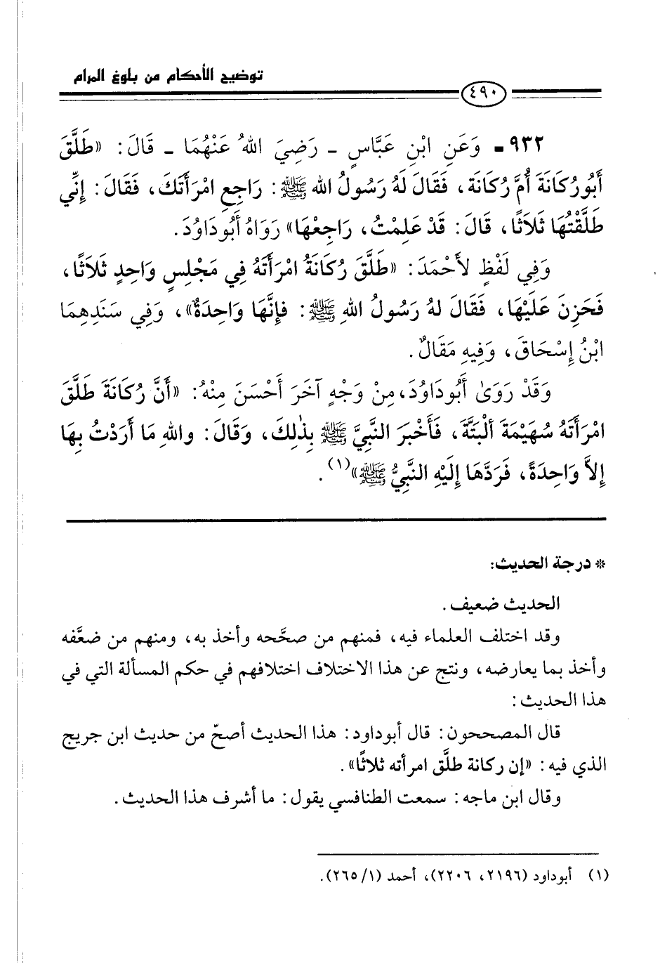 932 - وَعَنِ ابْنِ عَبَّاسٍ -رَضِيَ اللهُ عَنْهُمَا- قَالَ: "طَلَّقَ أَبُو رُكَانَةَ أُمَّ رُكَانَة، فَقَالَ لَهُ رَسُولُ الله -صلى الله عليه وسلم-: رَاجِعِ امْرَأَتَكَ، فَقَالَ: إِنِّي طَلَّقْتُهَا ثَلاَثًا، قَالَ: قَدْ عَلِمْتُ، رَاجِعْهَا" رَوَاهُ أَبُو دَاوُدَ.