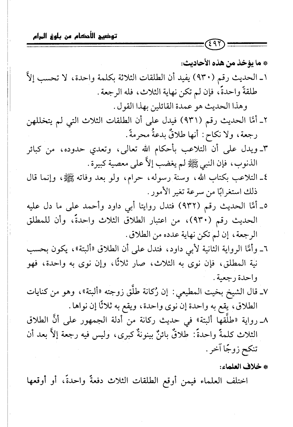 5 - أمَّا الحديث رقم (932) فتدل روايتا أبي داود وأحمد على ما دل عليه الحديث رقم (930)، من اعتبار الطلاق الثلاث واحدةً، وأن للمطلق الرجعة، إن لم تكن نهاية عدده من الطلاق.