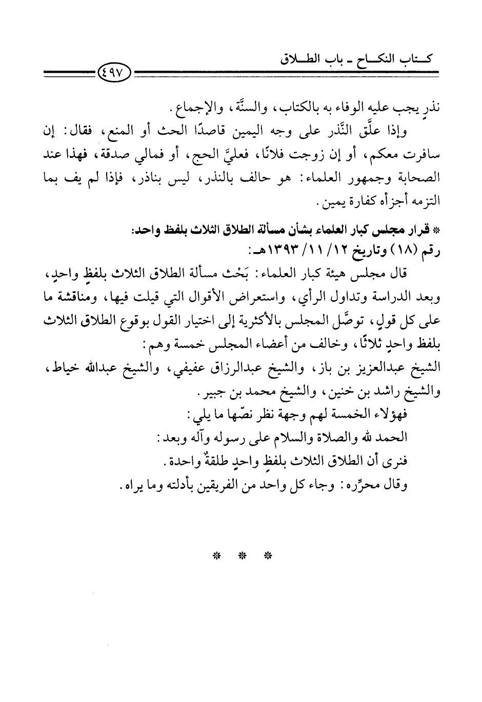 * قرار مجلس كبار العلماء بشأن مسألة الطلاق الثلاث بلفظ واحد: رقم (18) وتاريخ 12/ 11/ 1393 هـ: