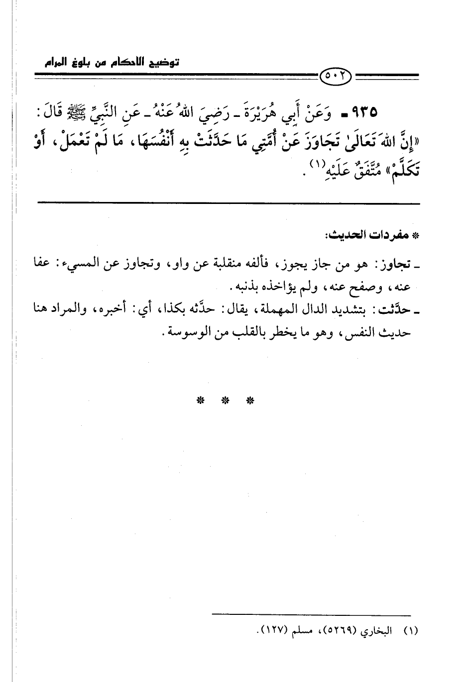 935 - وَعَنْ أَبي هُرَيْرَةَ -رَضِيَ اللهُ عَنْهُ- عَنِ النَّبِيِّ -صلى الله عليه وسلم- قَالَ: "إِنَّ اللهَ تَعَالَى تَجَاوَزَ عَنْ أُمَّتِي مَا حَدَّثَتْ بِهِ أَنْفُسَهَا، مَا لَمْ تَعْمَلْ، أوْ تَكَلَّمْ" مُتَّفَقٌ عَلَيْهِ (¬1).