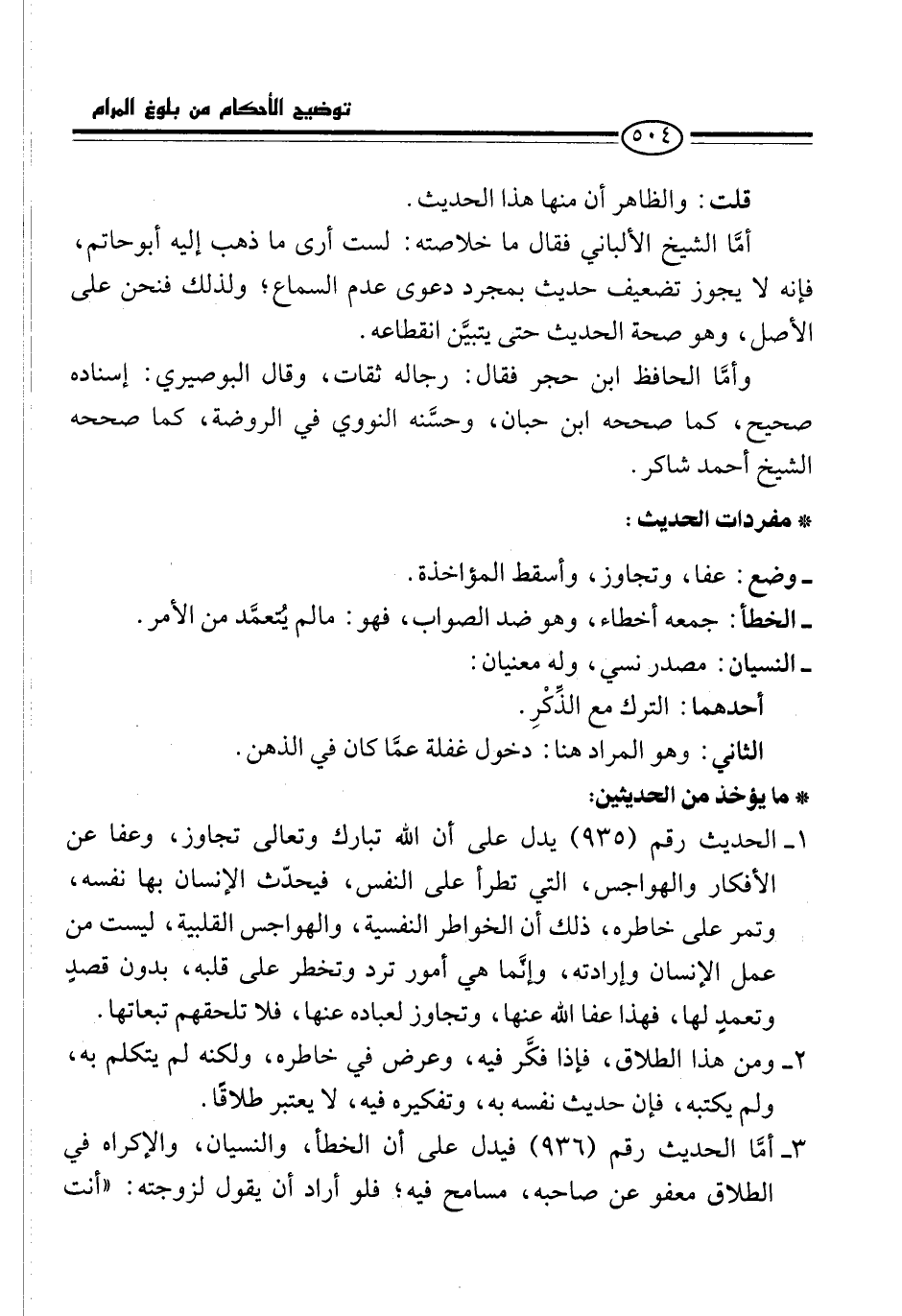 3 - أمَّا الحديث رقم (936) فيدل على أن الخطأ، والنسيان، والإكراه في الطلاق معفو عن صاحبه، مسامح فيه؛ فلو أراد أن يقول لزوجته: "أنت
