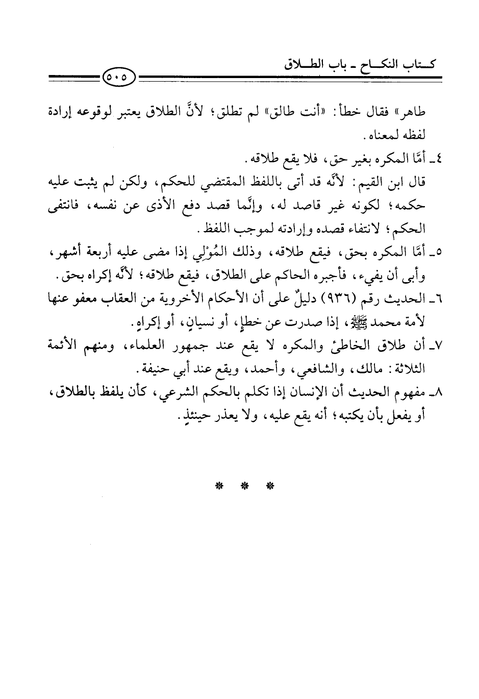 7 - أن طلاق الخاطىء والمكره لا يقع عند جمهور العلماء، ومنهم الأئمة الثلاثة: مالك، والشافعي، وأحمد، ويقع عند أبي حنيفة.