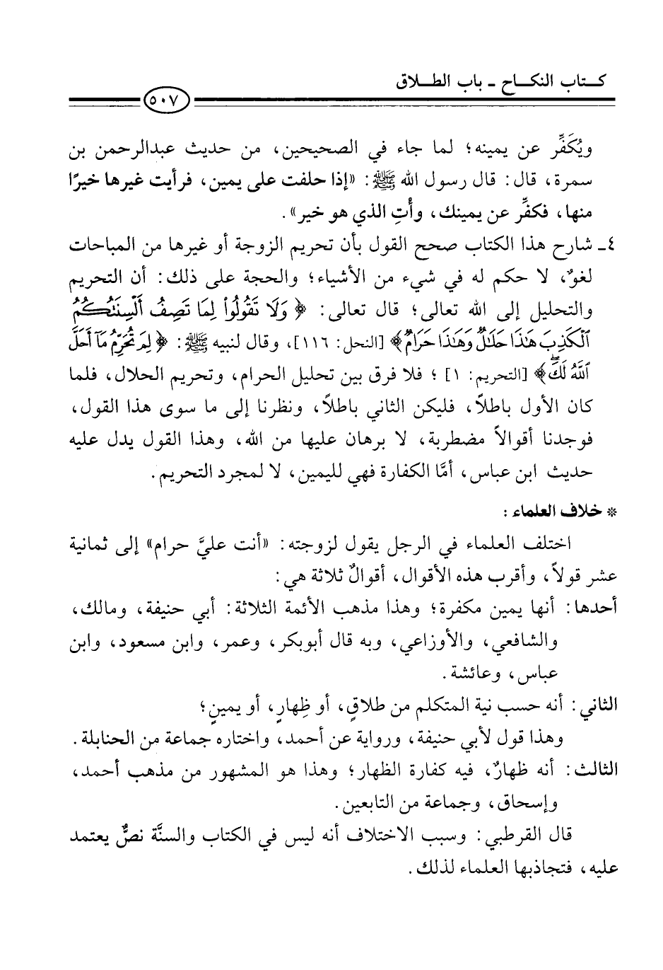4 - شارح هذا الكتاب صحح القول بأن تحريم الزوجة أو غيرها من المباحات لغوٌ، لا حكم له في شيء من الأشياء؛ والحجة على ذلك: أن التحريم والتحليل إلى الله تعالى؛ قال تعالى: {وَلَا تَقُولُوا لِمَا تَصِفُ أَلْسِنَتُكُمُ الْكَذِبَ هَذَا حَلَالٌ وَهَذَا حَرَامٌ} [النحل: 116]، وقال لنبيه -صلى الله عليه وسلم-: {يَاأَيُّهَا النَّبِيُّ لِمَ تُحَرِّمُ مَا أَحَلَّ اللَّهُ لَكَ} [التحريم: 1]؛ فلا فرق بين تحليل الحرام، وتحريم الحلال، فلما كان الأول باطلاً، فليكن الثاني باطلاً، ونظرنا إلى ما سوى هذا القول، فوجدنا أقوالاً مضطربة، لا برهان عليها من الله، وهذا القول يدل عليه حديث ابن عباس، أمَّا الكفارة فهي لليمين، لا لمجرد التحريم.