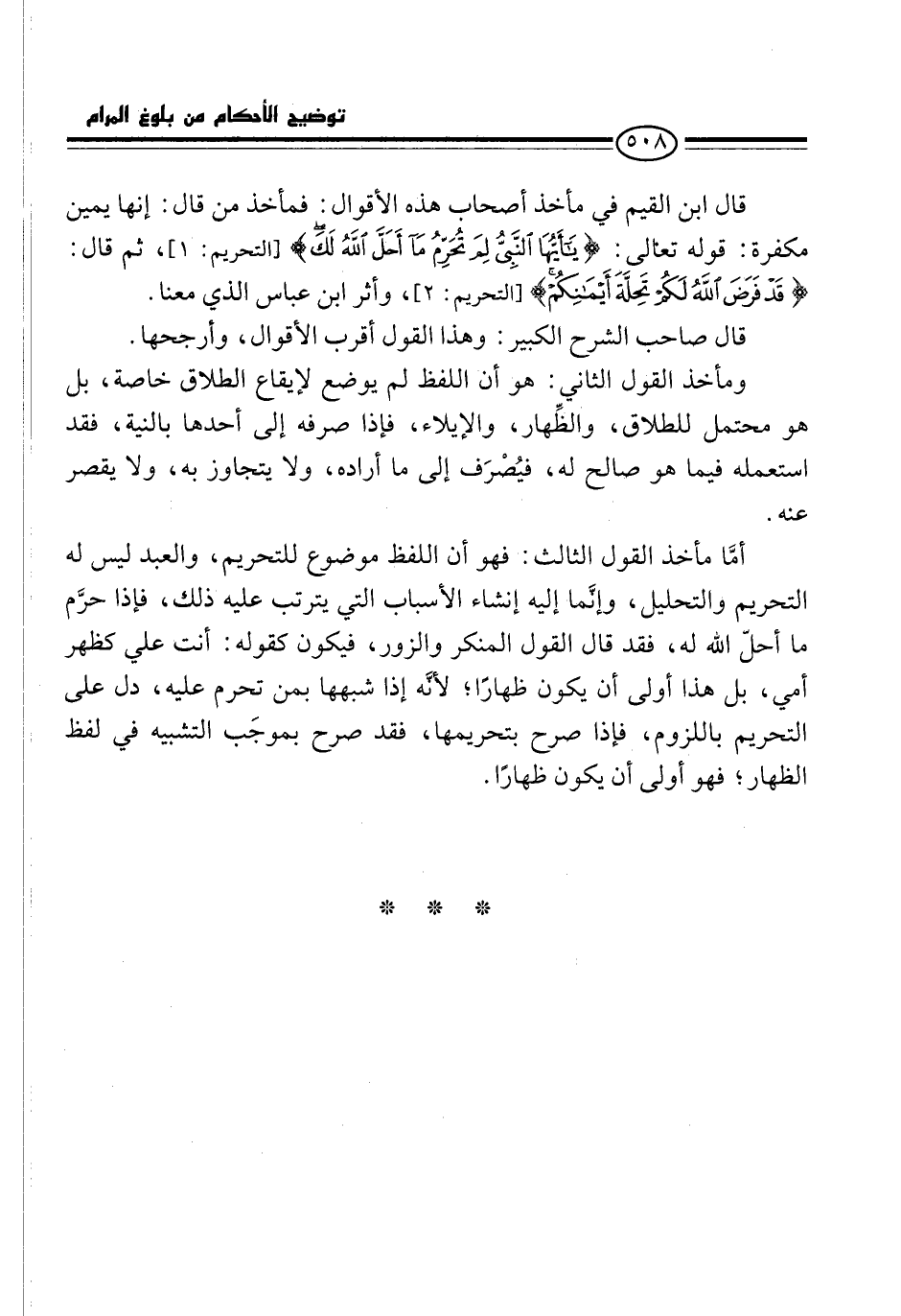 أمَّا مأخذ القول الثالث: فهو أن اللفظ موضوع للتحريم، والعبد ليس له التحريم والتحليل، وإنَّما إليه إنشاء الأسباب التي يترتب عليه ذلك، فإذا حرَّم ما أحلّ الله له، فقد قال القول المنكر والزور، فيكون كقوله: أنت علي كظهر أمي، بل هذا أولى أن يكون ظهارًا؛ لأنَّه إذا شبهها بمن تحرم عليه، دل على التحريم باللزوم، فإذا صرح بتحريمها، فقد صرح بموجَب التشبيه في لفظ الظهار؛ فهو أولى أن يكون ظهارًا.