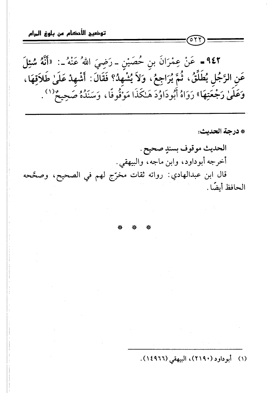 942 - عَنْ عِمْرَانَ بنِ حُصَيْنٍ -رَضِيَ اللهُ عَنْهُ-: "أَنَّهُ سُئِلَ عَنِ الرَّجُلِ يُطَلِّقُ، ثُمَّ يُرَاجِعُ، وَلاَ يُشْهِدُ؟ فَقَالَ: أَشْهِدْ عَلَى طَلاَقِهَا، وَعَلَى رَجْعَتِهَا" رَوَاهُ أَبُو دَاوُدَ هكَذَا مَوْقُوفًا، وَسَنَدُهُ صَحِيحٌ (¬1).