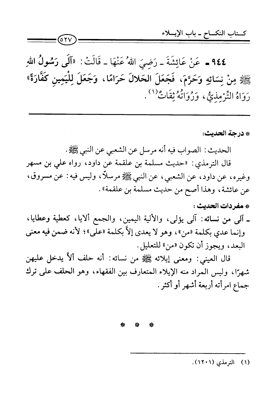 944 - عَنْ عَائِشَةَ -رَضِيَ اللهُ عَنْهَا- قَالَتْ: "آلَى رَسُولُ اللهِ -صلى الله عليه وسلم- منْ نِسَائِه وَحَرَّمَ، فَجَعَلَ الحَلالَ حَرَامًا، وَجَعَلَ لِلْيَمِينِ كَفَّارَةً" رَوَاهُ التِّرْمِذِيُّ، وَرُوَاتُهُ ثِقَاتٌ (¬1).