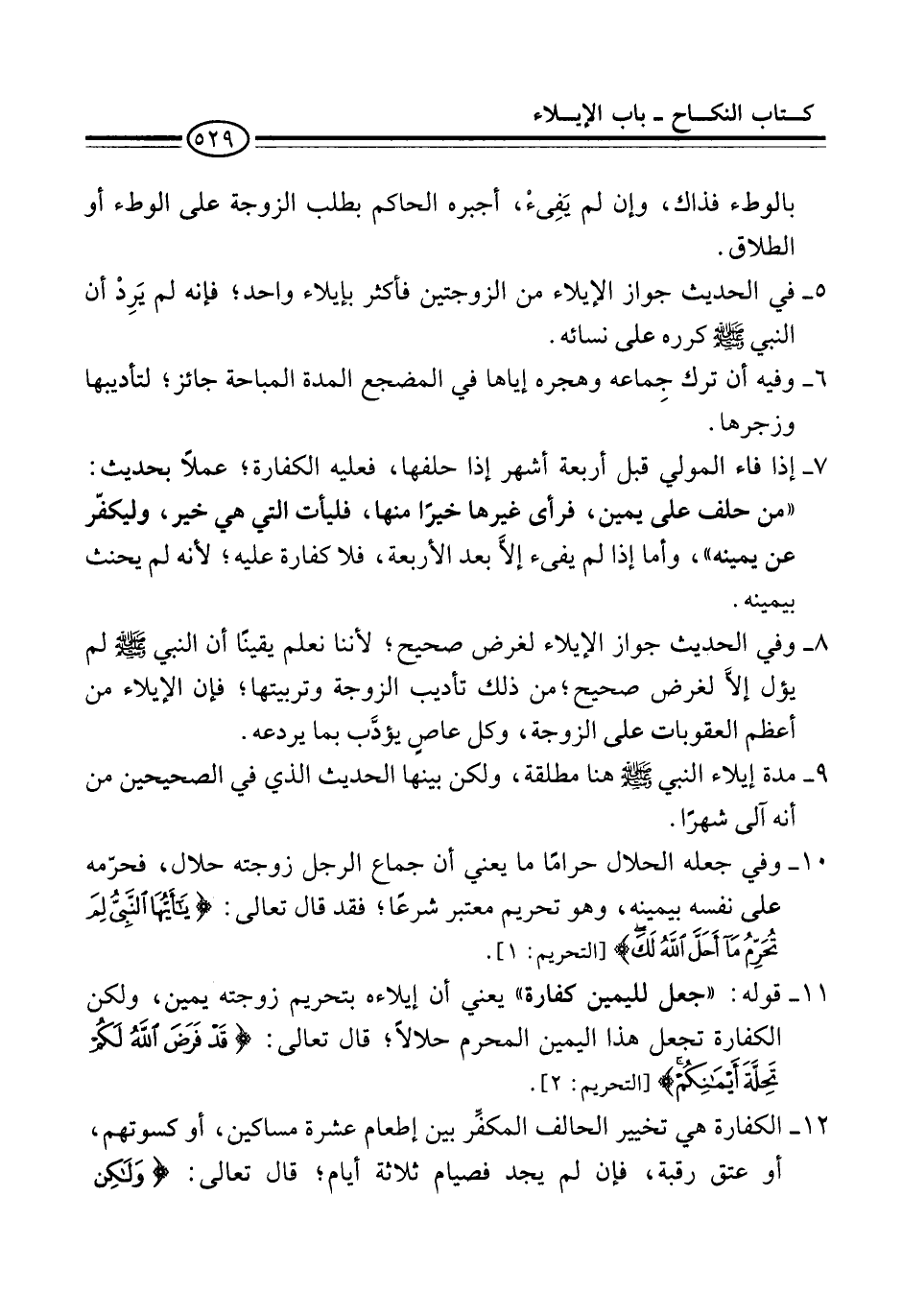 11 - قوله: "جعل لليمين كفارة" يعني أن إيلاءه بتحريم زوجته يمين، ولكن الكفارة تجعل هذا اليمين المحرم حلالًا، قال تعالى: {قَدْ فَرَضَ اللَّهُ لَكُمْ تَحِلَّةَ أَيْمَانِكُمْ} [التحريم: 2].