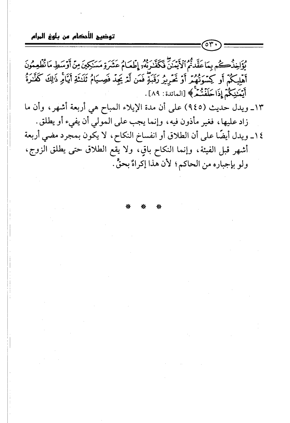 14 - ويدل أيضًا على أن الطلاق أو انفساخ النكاح، لا يكون بمجرد مضي أربعة أشهر قبل الفيئة، وإنما النكاح باقٍ، ولا يقع الطلاق حتى يطلق الزوج، ولو بإجباره من الحاكم؛ لأن هذا إكراهٌ بحقٍّ.