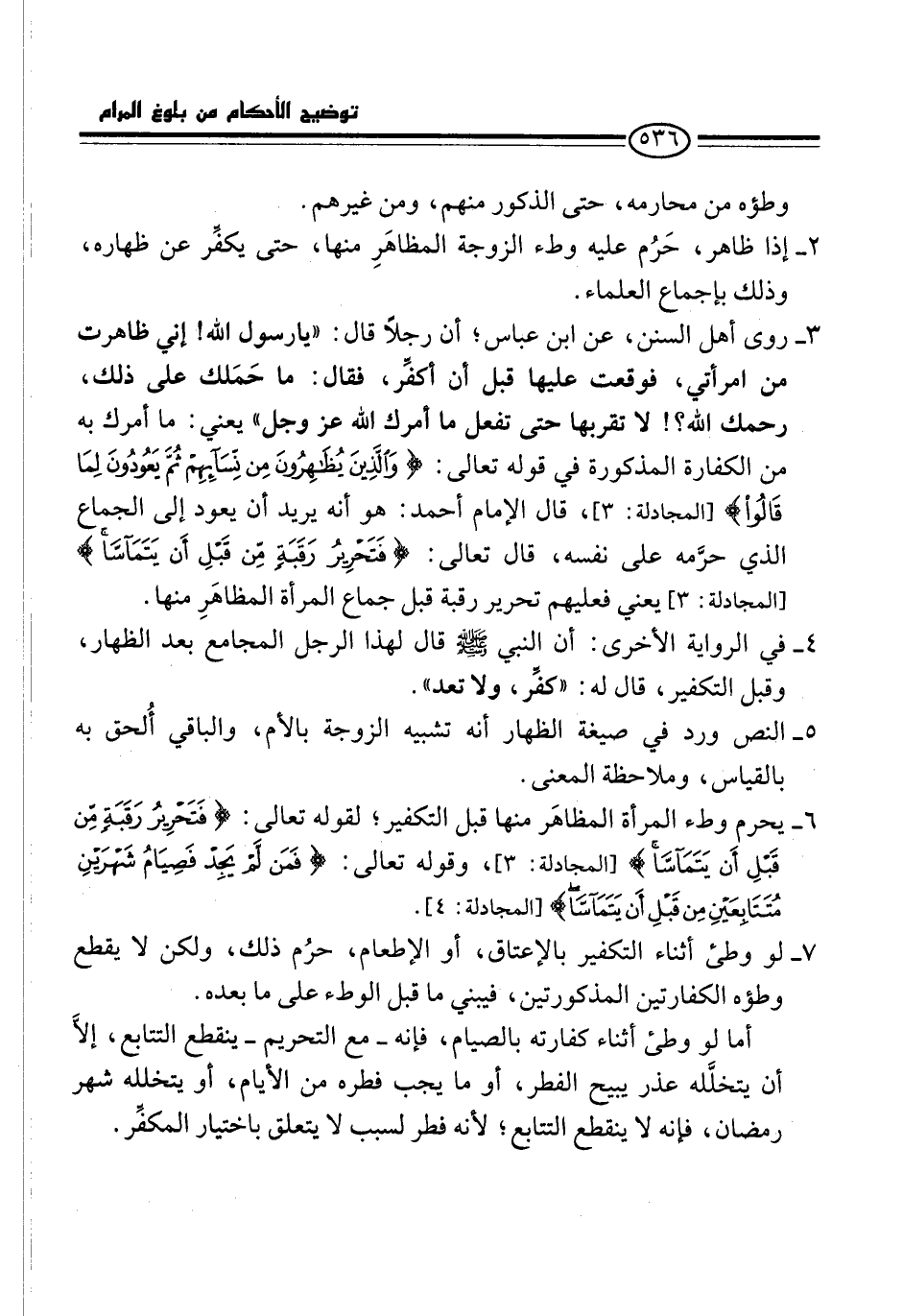 3 - روى أهل السنن، عن ابن عباس؛ أن رجلاً قال: "يارسول الله! إني ظاهرت من امرأتي، فوقعت عليها قبل أن أكفِّر، فقال: ما حَمَلك على ذلك، رحمك الله؟! لا تقربها حتى تفعل ما أمرك الله عز وجل" يعني: ما أمرك به من الكفارة المذكورة في قوله تعالى: {وَالَّذِينَ يُظَاهِرُونَ مِنْ نِسَائِهِمْ ثُمَّ يَعُودُونَ لِمَا قَالُوا} [المجادلة: 3]، قال الإمام أحمد: هو أنه يريد أن يعود إلى الجماع الذي حرَّمه على نفسه، قال تعالى: {فَتَحْرِيرُ رَقَبَةٍ مِنْ قَبْلِ أَنْ يَتَمَاسَّا} [المجادلة: 3] يعني فعليهم تحرير رقبة قبل جماع المرأة المظاهَرِ منها.