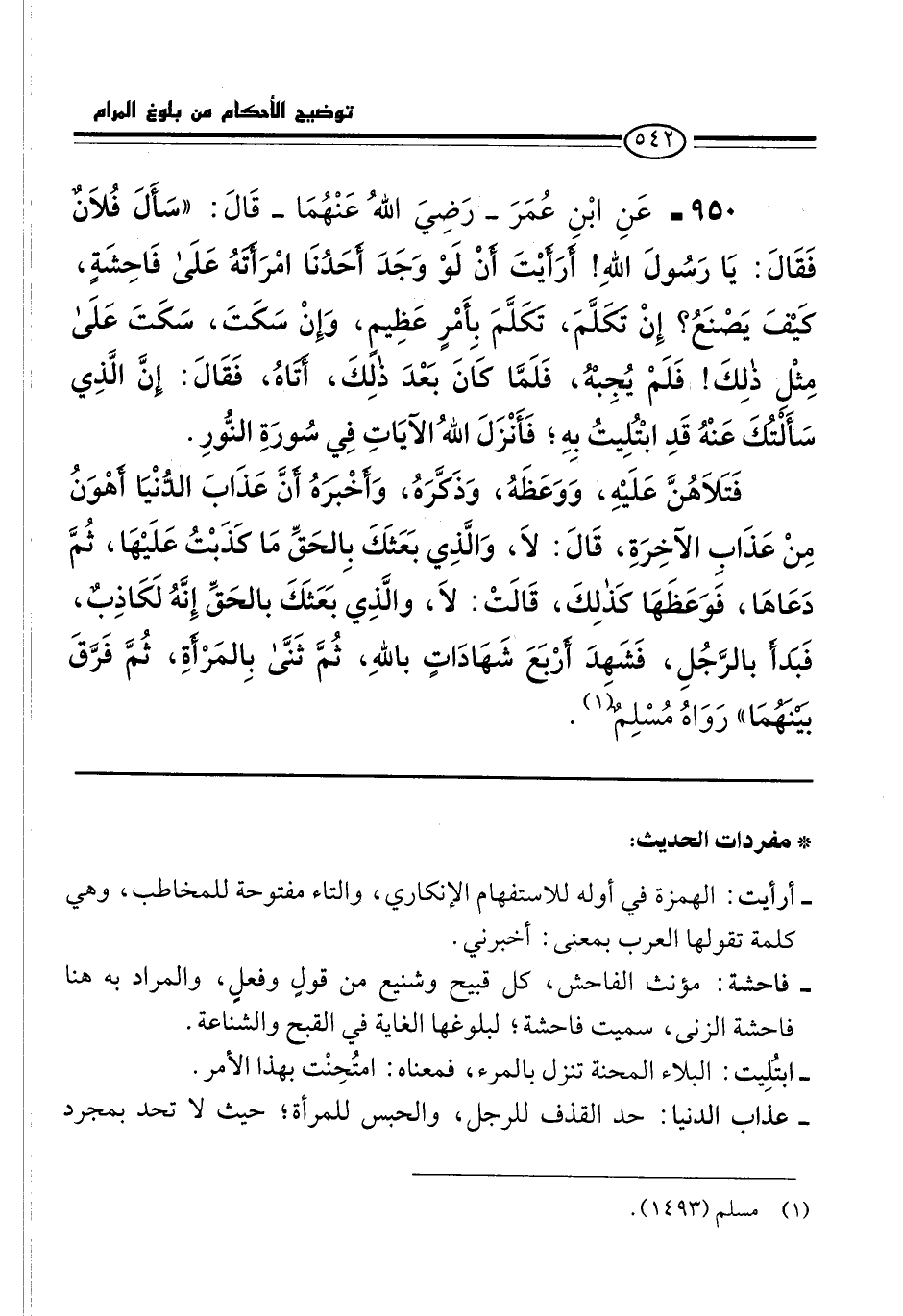 950 - عَنِ ابْنِ عُمَرَ -رَضِيَ اللهُ عَنْهُمَا- قَالَ: "سَأَلَ فُلاَنٌ فَقَالَ: يَا رَسُولَ اللهِ! أَرَأَيْتَ أَنْ لَوْ وَجَدَ أَحَدُنَا امْرَأتهُ عَلَى فَاحِشَةٍ، كَيْفَ يَصْنعُ؟ إِنْ تَكَلَّمَ، تَكَلَّمَ بِأَمْرٍ عَظِيمٍ، وَإِنْ سَكَتَ، سَكَتَ عَلَى مِثْل ذلِكَ! فَلَمْ يُجِبهُ، فَلَمَّا كَانَ بَعْدَ ذلِكَ، أَدَاهُ، فَقَالَ: إنَّ الَّذِي سَأَلتُكَ عَنْهُ قَدِ ابْتُلِيتُ بِهِ؛ فَأَنْزَلَ اللهُ الآيَاتِ فِي سُورَةِ النُّورِ. فَتَلاَهُنَّ عَلَيْهِ، وَوَعَظَهُ، وَذَكَّرَهُ، وَأخْبرَهُ أنَّ عَذَابَ الدُّنْيَا أهْوَنُ مِنْ عَذَابِ الآخِرَةِ، قَالَ: لاَ، وَالَّذِي بَعَثَكَ بِالحَقِّ مَا كَذَبْتُ عَلَيْهَا، ثُمَّ دَعَاهَا، فَوَعَظَهَا كذلِكَ، قَالَتْ: لاَ، والَّذِي بَعَثَكَ بالحَقِّ إِنَّهُ لَكَاذِبٌ، فَبَدأ بالرَّجُلِ، فَشَهِدَ أرْبَعَ شَهَادَاتٍ باللهِ، ثُمَّ ثَنَّى بالمَرْأةِ، ثُمَّ فَرَّقَ بَيْنَهُمَا" رَوَاهُ مُسْلِمٌ (¬1).