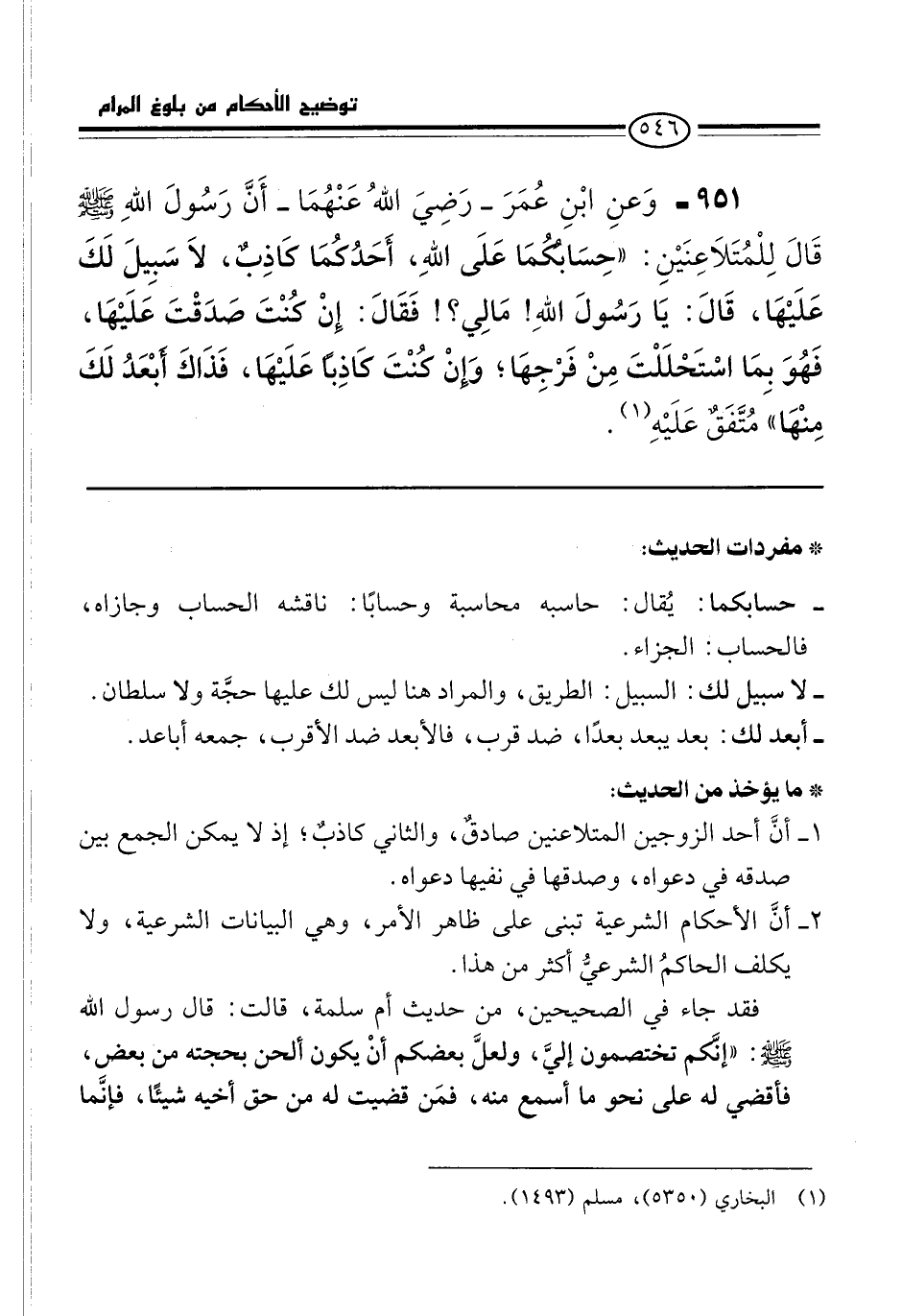 951 - وَعنِ ابْنِ عُمَرَ -رَضِيَ اللهُ عَنْهُمَا- أَنَّ رَسُولَ اللهِ -صلى الله عليه وسلم- قَالَ لِلْمُتَلاَعِنَيْنِ: "حِسَابُكُمَا عَلَى اللهِ، أَحَدُكُمَا كاذِبٌ، لاَ سَبِيلَ لَكَ عَلَيْهَا، قَالَ: يَا رَسُولَ اللهِ! مَالِي؟! فَقَالَ: إِنْ كُنْتَ صَدَقْتَ عَلَيْهَا، فَهُوَ بِمَا اسْتَحْلَلْتَ مِنْ فَرْجِهَا، وَانْ كنْتَ كاذِبًا عَلَيْهَا، فَذَاكَ أَبْعَدُ لَكَ مِنْهَا" مُتَّفَقٌ عَلَيْهِ (¬1).