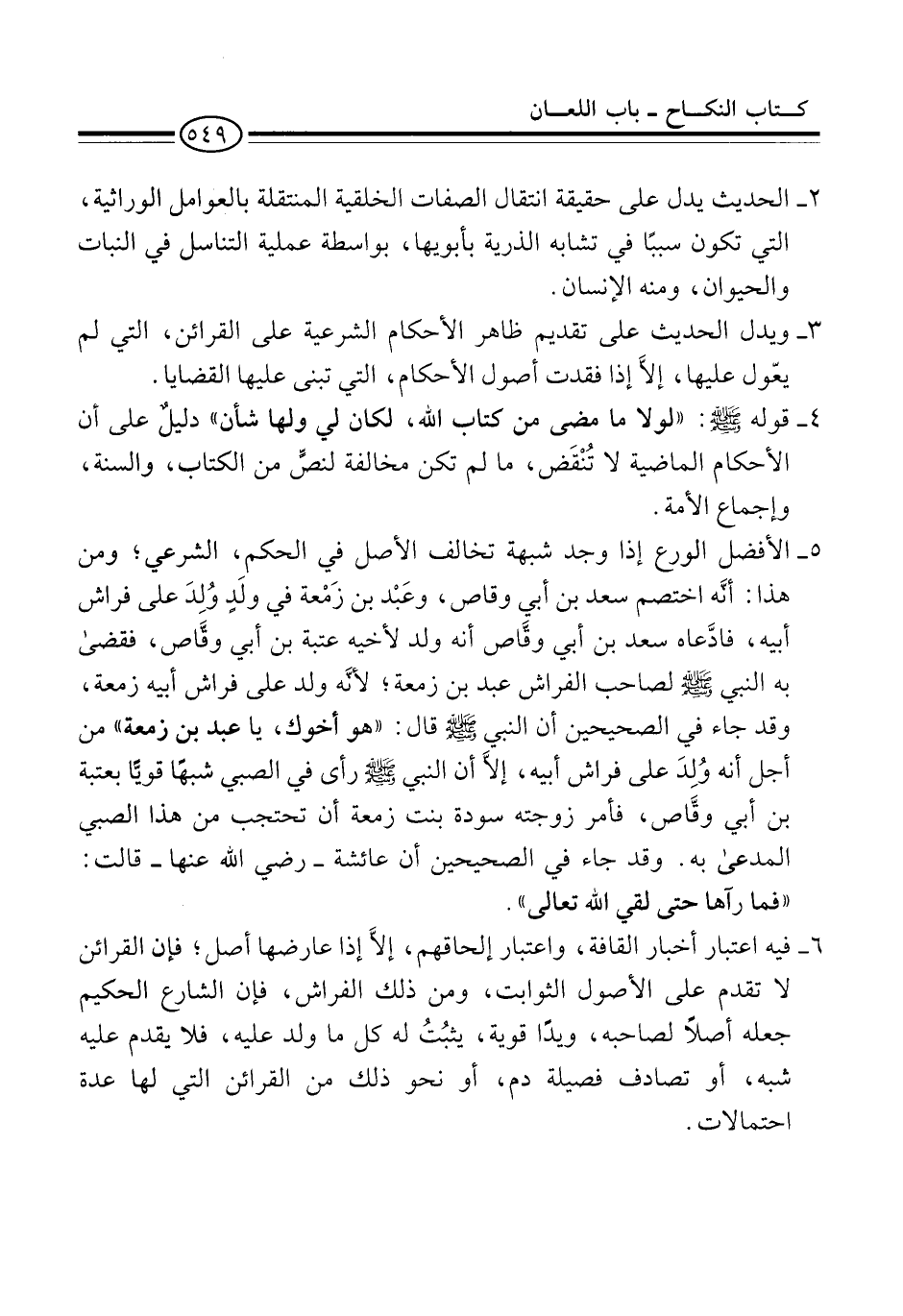 6 - فيه اعتبار أخبار القافة، واعتبار إلحاقهم، إلاَّ إذا عارضها أصل؛ فإن القرائن لا تقدم على الأصول الثوابت، ومن ذلك الفراش، فإن الشارع الحكيم جعله أصلًا لصاحبه، ويدًا قوية، يثبُتُ له كل ما ولد عليه، فلا يقدم عليه شبه، أو تصادف فصيلة دم، أو نحو ذلك من القرائن التى لها عدة احتمالات.