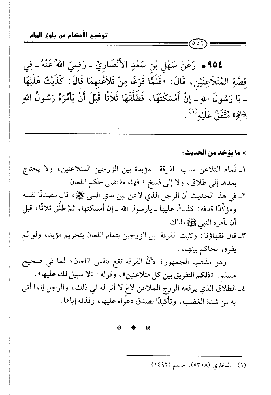 954 - وَعَنْ سَهْلِ بْنِ سَعْدٍ الأنْصَارِيِّ -رَضِيَ اللهُ عَنْهُ- فِي قِصَّةِ المُتَلاَعِنَيْنِ، قَالَ: "فَلَمَّا فَرَغَا مِنْ تَلاَعُنهِمَا قَالَ: كَذَبْتُ عَلَيْهَا -يَا رَسُولَ اللهِ- إِنْ أَمْسَكْتُهَا، فَطَلَّقَهَا ثَلاَثًا قَبْلَ أَنْ يَأمُرَهُ رَسُولُ اللهِ -صلى الله عليه وسلم- مُتَّفَقٌ عَلَيْهِ (¬1).