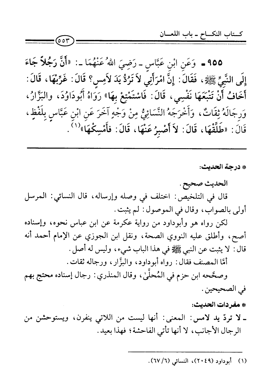 955 - وَعَنِ ابْنِ عَبَّاسٍ -رَضِيَ اللهُ عَنْهُمَا-: "أَنَّ رَجُلاً جَاءَ إِلَى النَّبِيِّ -صلى الله عليه وسلم-، فَقَالَ: إِنَّ امْرَأَتِي لاَ تَرُدُّ يَدَ لاَمِسٍ؟ قَالَ: غَرِّبْهَا، قَالَ: أَخَافُ أَنْ تَتْبَعَهَا نَفْسِي، قَالَ: فَاسْتَمْتِعْ بِهَا" رَوَاهُ أَبُو دَاوُدَ، والبَزَّارُ، وَرِجَالَهُ ثِقَاتٌ، وَأَخْرَجَهُ النَّسَائيُّ مِنْ وَجْهٍ آخَرَ عَنِ ابْنِ عَبَّاسٍ بِلَفْظٍ، قَالَ: "طَلِّقْهَا، قَالَ: لاَ أَصْبِرُ عَنْهَا، قَالَ: فأَمْسِكْهَا" (¬1).