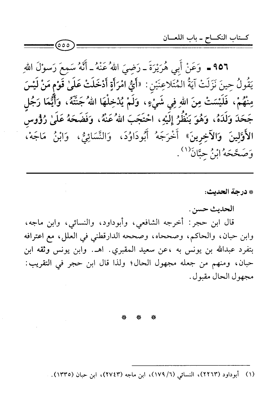 956 - وَعَنْ أَبِي هُرَيْرَةَ -رَضِيَ اللهُ عَنْهُ- أَنَّهُ سَمِعَ رَسوْلَ اللهِ يَقُولُ حِينَ نَزَلَتْ آيَةُ المُتَلاعِنَيْنِ: "أَيُّ امْرَاةٍ ادْخَلَتْ عَلَى قَوْمٍ مَنْ لَيْسَ مِنْهُمْ، فَلَيْسَتْ مِنَ اللهِ فِي شَيْءٍ، وَلَمْ يُدْخِلْهَا اللهُ جَنَّتَهُ، وَأَيُّمَا رَجُلٍ جَحَدَ وَلَدَهُ، وَهُوَ يَنْظُرُ إلَيْهِ، احْتَجَبَ اللهُ عَنْهُ، وَفَضَحَهُ عَلَى رُؤُوسِ الأَوَّلِينَ وَالآخِرِينَ" أَخْرَجَهُ أَبُو دَاوُدَ، وَالنَّسَائيُّ، وَابْنُ مَاجَهْ، وَصَحَّحَهُ ابْنُ حِبَّانَ (¬1).