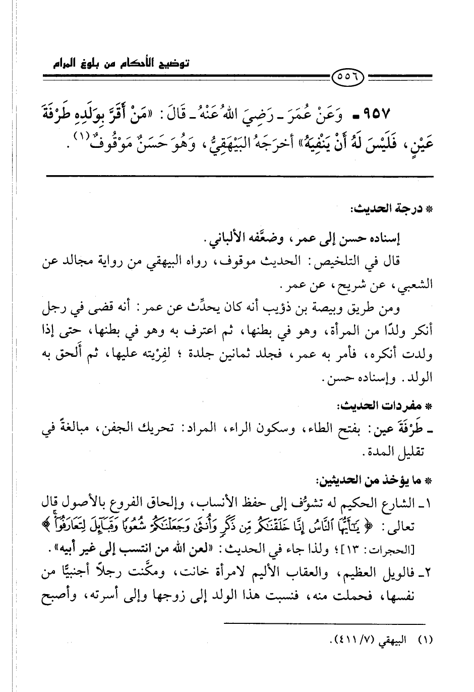 957 - وَعَنْ عُمَرَ -رَضِيَ اللهُ عَنْهُ- قَالَ: "مَنْ أقَرَّ بِوَلَدِهِ طَرْفَةَ عَيْنٍ، فَلَيْسَ لَهُ أَنْ يَنْفِيَهُ" أخرَجَهُ البَيْهَقِيُّ، وَهُوَ حَسَنٌ مَوْقُوفٌ (¬1).