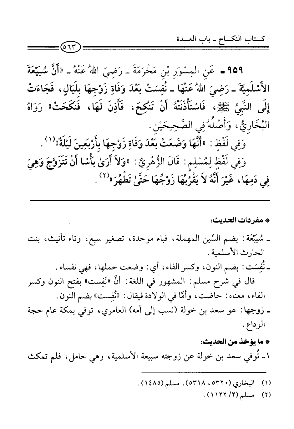 959 - عَنِ المِسْوَرِ بْنِ مَخْرَمَةَ -رَضِيَ اللهُ عَنْهُ- "أَنَّ سُبَيْعَةَ الأَسْلَمِيَّةَ -رَضِيَ اللهُ عَنْهَا- نُفِسَتْ بَعْدَ وَفَاةِ زَوْجِهَا بلَيَالٍ، فَجَاءَتْ إِلَى النَّبِيِّ -صلى الله عليه وسلم-، فَاسْتَأْذَنَتْهُ أَنْ تَنْكِحَ، فَأَذِنَ لَهَا، فَنَكَحَتْ" رَوَاهُ البُخَارِيُّ، وَأَصْلُهُ فِي الصَّحِيحَيْنِ.