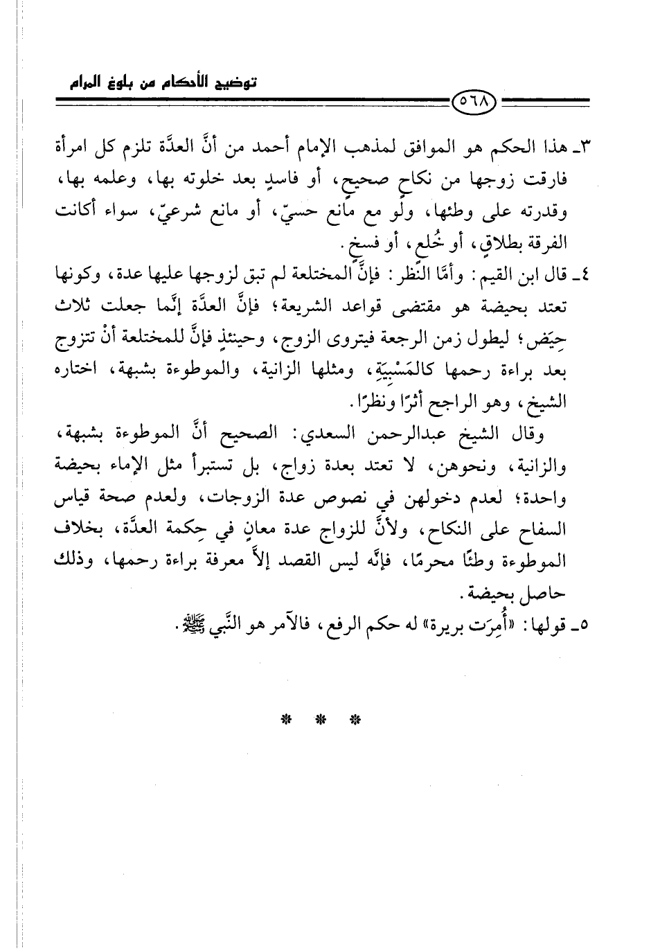 3 - هذا الحكم هو الموافق لمذهب الإمام أحمد من أنَّ العدَّة تلزم كل امرأة فارقت زوجها من نكاحٍ صحيحٍ، أو فاسدٍ بعد خلوته بها، وعلمه بها، وقدرته على وطئها، ولو مع مانع حسيّ، أو مانع شرعيّ، سواء أكانت الفرقة بطلاقٍ، أو خُلعٍ، أو فسخٍ.
