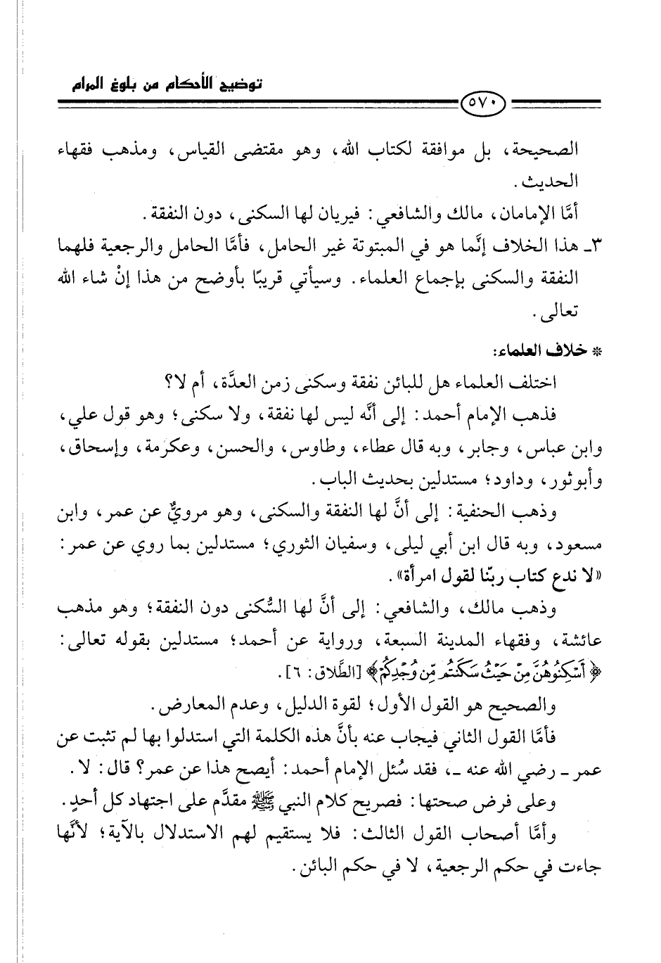 3 - هذا الخلاف إنَّما هو في المبتوتة غير الحامل، فأمَّا الحامل والرجعية فلهما النفقة والسكنى بإجماع العلماء. وسيأتي قريبًا بأوضح من هذا إنْ شاء الله تعالى.