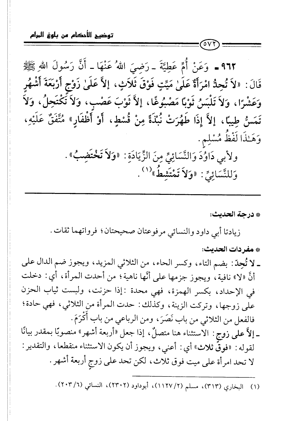 962 - وَعَنْ أُمِّ عَطِيَّةَ -رَضِيَ اللهُ عَنْهَا- أَنَّ رَسُولَ اللهِ -صلى الله عليه وسلم- قَالَ: "لاَ تُحِدُّ امْرَأَةٌ عَلَى مَيِّتٍ فَوْقَ ثَلاَثٍ، إلاَّ عَلَى زَوْجٍ أَرْبَعَةَ اشْهُرٍ وَعَشْرًا، وَلاَ تَلْبَسُ ثَوْبًا مَصْبُوغًا، إلاَّ ثَوْبَ عَصْب، وَلاَ تَكْتَحِلُ، وَلاَ تَمَسُّ طِيبًا، إلاَّ إِذَا طَهُرَتْ نُبْذَةً مِنْ قُسْطٍ، أَوْ أَظْفَارٍ" مُتَّفَقٌ عَلَيْهِ، وَهَذَا لَفْظُ مُسْلِمٍ.