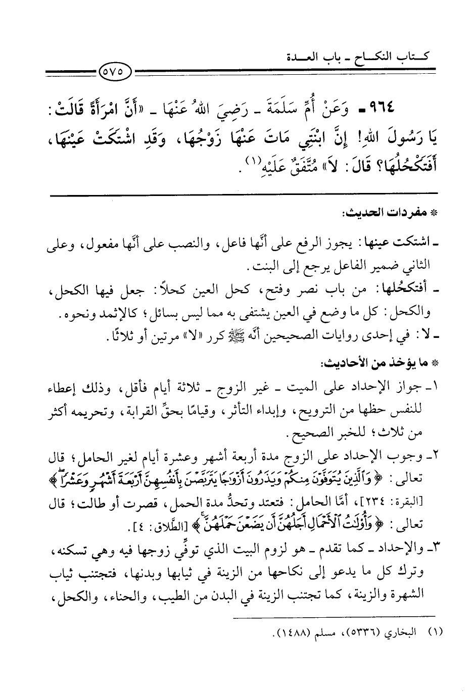 964 - وَعَنْ أُمِّ سَلَمَةَ -رَضِيَ اللهُ عَنْهَا- "أَنَّ امْرَأَةً قَالَتْ: يَا رَسُولَ اللهِ! إِنَّ ابْنتَي مَاتَ عَنْهَا زَوْجُهَا، وَقَدِ اشْتَكَتْ عَيْتَهَا، أَفَتَكْحُلُهَا؛ قَالَ: لاَ" مُتَّفَقٌ عَلَيْهِ (¬1).