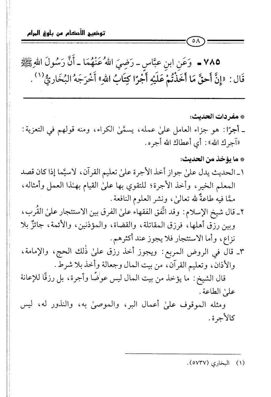 785 - وَعَنِ ابنِ عبَّاسٍ -رَضِيَ اللهُ عَنْهُمَا- أَنَّ رَسُولُ اللهِ -صلى الله عليه وسلم- قَال: "إِنَّ أَحقَّ مَا أَخَذْتُمْ عَلَيْهِ أَجْرًا كتَابُ اللهِ" أَخْرَجَهُ البُخَاريُّ (¬1)،