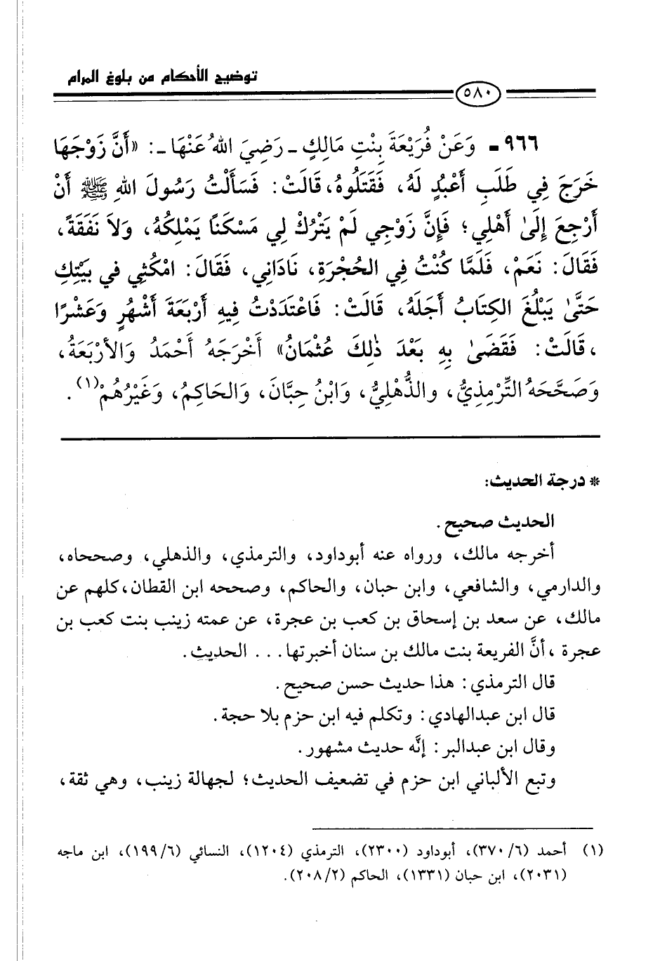 966 - وَعَنْ فُرَيْعَةَ بِنْتِ مَالِكٍ -رَضِيَ اللهُ عَنْهَا-: "أَنَّ زَوْجَهَا خَرَجَ فِي طَلَبِ أَعْبُدٍ لَهُ، فَقَتَلُوهُ، قَالَتْ: فَسَأَلْتُ رَسُولَ اللهِ -صلى الله عليه وسلم- أَنْ أَرْجِعَ إِلَى أَهْلِي، فَإِنَّ زَوْجِي لَمْ يَتْرُكْ لِي مَسْكَنًا يَمْلِكُهُ، وَلاَ نَفَقَةً، فَقَالَ: نَعَمْ، فَلَمَّا كنْتُ فِي الحُجْرَةِ، نَادَانِي، فَقَالَ: امْكُثي في بَيْتِكِ حَتَّى يَبْلُغَ الكِتَابُ أَجَلَهُ، قَالَتْ: فَاعْتَدَدْتُ فِيهِ أَرْبَعَةَ أَشْهُرٍ وَعَشْرًا، قَالَتْ: فَقَضَى بِهِ بَعْدَ ذلِكَ عُثْمَانُ" أَخْرَجَهُ أَحْمَدُ وَالأرْبَعَةُ، وَصَحَّحَهُ التِّرْمِذِيُّ، والذُّهْلِيُّ، وَابْنُ حِبَّانَ، وَالحَاكِمُ، وَغَيْرُهُمْ (¬1).