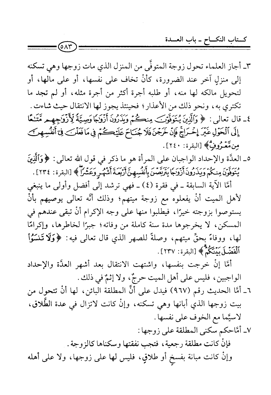 6 - أمَّا الحديث رقم (967) فيدل على أنَّ المطلقة البائن، لها أنْ تتحول من بيت زوجها الذي أبانها وهي تسكنه، وإنْ كانت لا تزال في عدة الطَّلاق، لاسيَّما مع الخوف على نفسها.