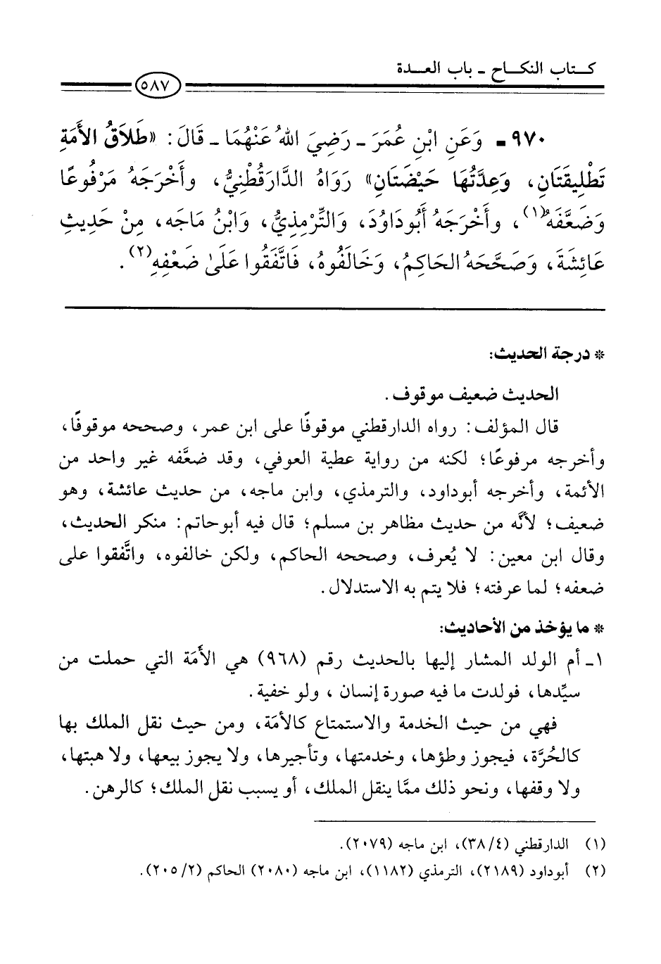 970 - وَعَنِ ابْنِ عُمَرَ -رَضِيَ اللهُ عَنْهُمَا- قَالَ: "طَلاَقُ الأَمَةِ تَطْلِيقَتَانِ، وَعِدَّتُهَا حَيْضَتَانِ" رَوَاهُ الدَّارَقُطْنِيُّ، وأَخْرَجَهُ مَرْفُوعًا وَضَعَّفَهُ (¬1)، وأَخْرَجَهُ أَبُو دَاوُدَ، وَالتِّرْمِذِيُّ، وَابْنُ مَاجَه، مِنْ حَدِيثِ عَائِشَةَ، وَصَحَّحَهُ الحَاكِمُ، وَخَالَفُوهُ، فَاتَّفَقُوا عَلَى ضَعْفِهِ (¬2).