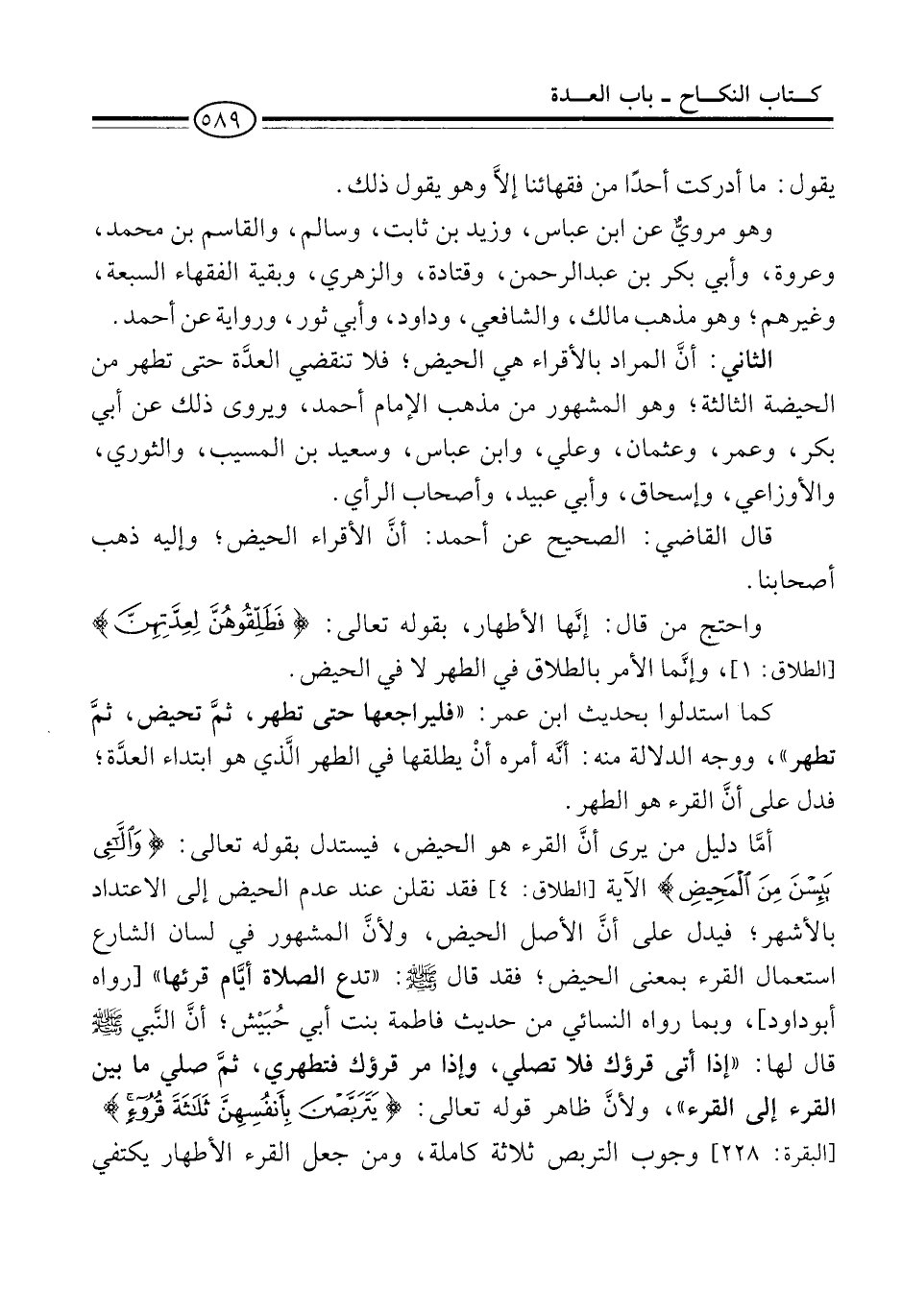 الثاني: أنَّ المراد بالأقراء هي الحيض؛ فلا تنقضي العدَّة حتى تطهر من الحيضة الثالثة؛ وهو المشهور من مذهب الإمام أحمد، ويروى ذلك عن أبي بكر، وعمر، وعثمان، وعلي، وابن عباس، وسعيد بن المسيب، والثوري، والأوزاعي، وإسحاق، وأبي عبيد، وأصحاب الرأي.