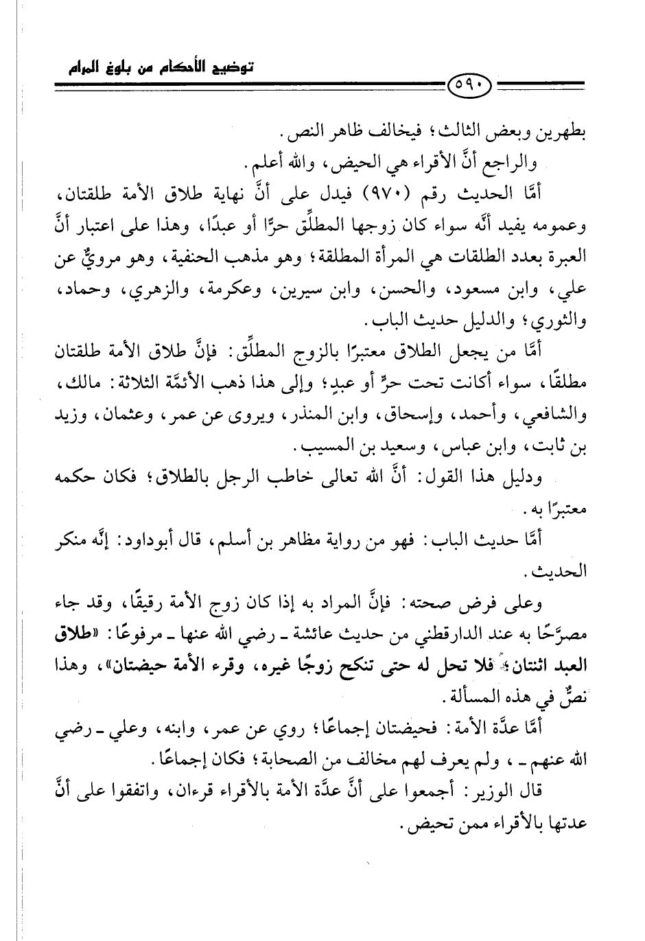 أمَّا الحديث رقم (970) فيدل على أنَّ نهاية طلاق الأمة طلقتان، وعمومه يفيد أنَّه سواء كان زوجها المطلِّق حرًّا أو عبدًا، وهذا على اعتبار أنَّ العبرة بعدد الطلقات هي المرأة المطلقة؛ وهو مذهب الحنفية، وهو مرويٌّ عن علي، وابن مسعود، والحسن، وابن سيرين، وعكرمة، والزهري، وحماد، والثوري، والدليل حديث الباب.