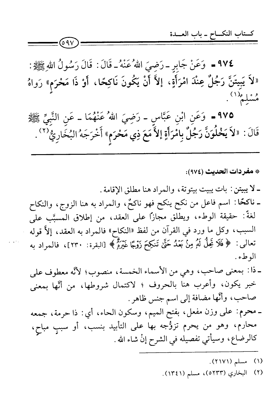 974 - وَعَنْ جَابرٍ -رَضِيَ اللهُ عَنْهُ- قَالَ: قَالَ رَسُولُ اللهِ -صلى الله عليه وسلم-: "لاَ يَبِيتَنَّ رَجُل عِنْدَ امْرَأَةٍ، إلاَّ أنْ يَكُونَ نَاكحًا، أَوْ ذَا مَحْرَمٍ" رَواهُ مُسْلِمٌ (¬1).