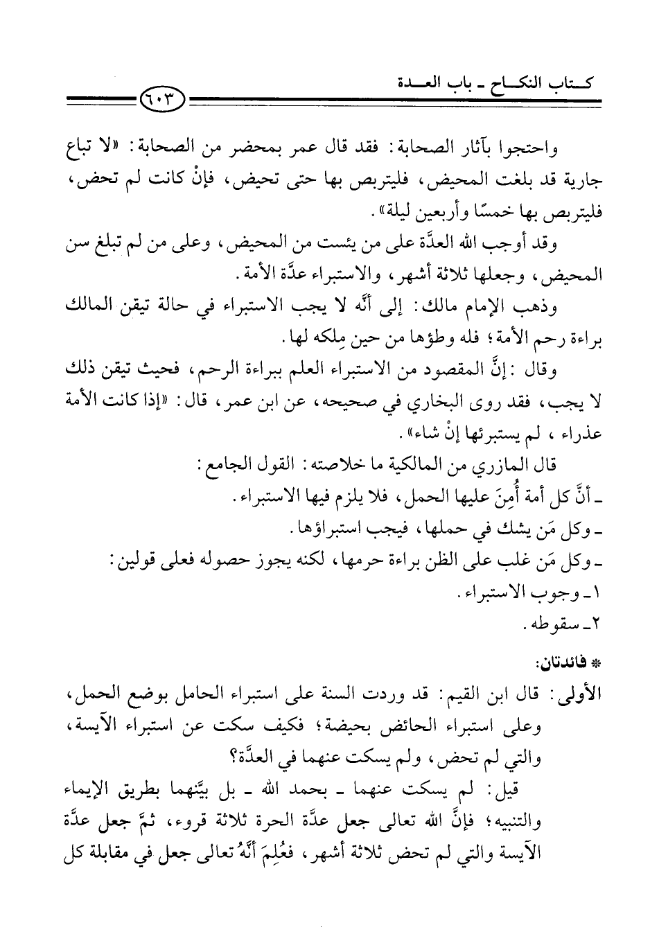 الأولى: قال ابن القيم: قد وردت السنة على استبراء الحامل بوضع الحمل، وعلى استبراء الحائض بحيضة، فكيف سكت عن استبراء الآيسة، والتي لم تحض، ولم يسكت عنهما في العدَّة؟