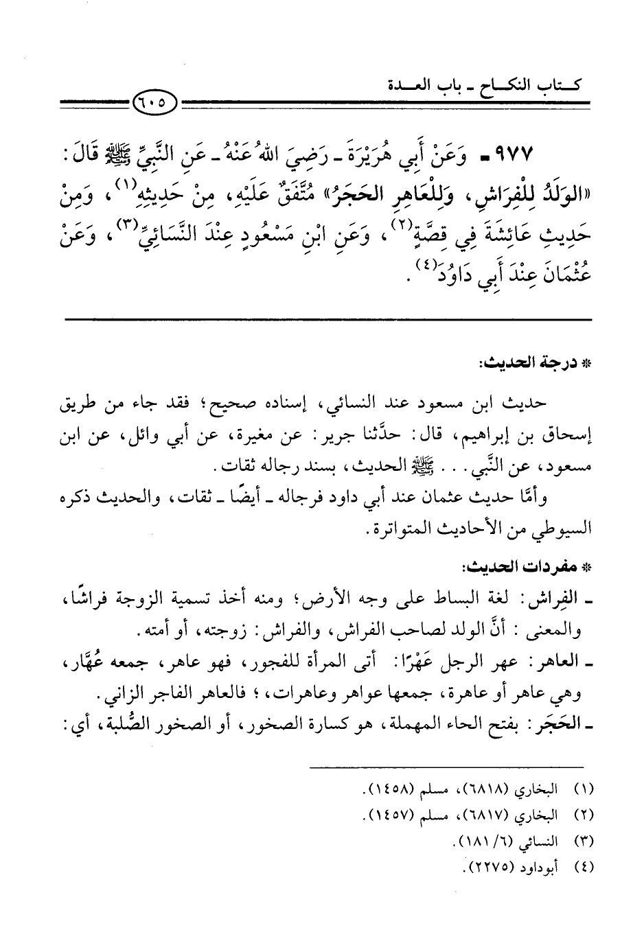 977 - وَعَنْ أَبِي هُرَيْرَةَ -رَضِيَ اللهُ عَنْهُ- عَنِ النَّبِيِّ -صلى الله عليه وسلم- قَالَ: "الوَلَدُ لِلْفِرَاشِ، وَلِلْعَاهِرِ الحَجَرُ" مُتَّفَقٌ عَلَيْهِ، مِنْ حَدِيثِهِ (¬1)، وَمِنْ حَدِيثِ عَائِشَةَ فِي قِصَّةٍ (¬2)، وَعَنِ ابْنِ مَسْعُودٍ عِنْدَ النَّسَائِيِّ (¬3)، وَعَنْ عُثْمَانَ عِنْدَ أِبي دَاوُدَ (¬4).