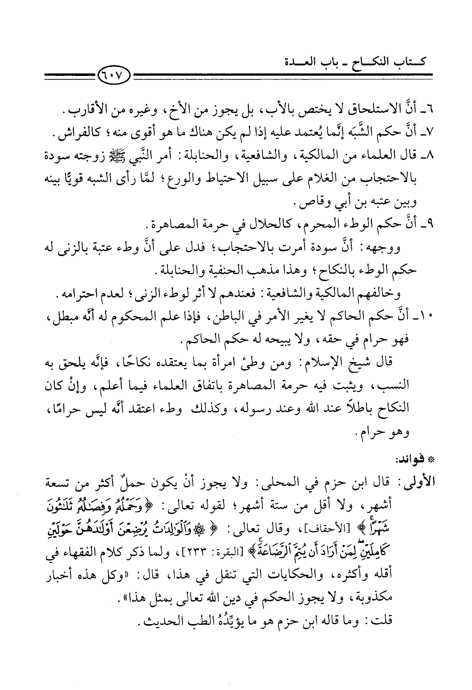 الأولى: قال ابن حزم في المحلى: ولا يجوز أنْ يكون حملٌ أكثر من تسعة أشهر، ولا أقل من ستة أشهر؛ لقوله تعالى: {وَحَمْلُهُ وَفِصَالُهُ ثَلَاثُونَ شَهْرًا} [الأحقاف] وقال تعالى: {وَالْوَالِدَاتُ يُرْضِعْنَ أَوْلَادَهُنَّ حَوْلَيْنِ كَامِلَيْنِ لِمَنْ أَرَادَ أَنْ يُتِمَّ الرَّضَاعَةَ} [البقرة: 233]، ولما ذكر كلام الفقهاء في أقله وأكثره، والحكايات التي تنقل في هذا، قال: "وكل هذه أخبار مكذوبة، ولا يجوز الحكم في دين الله تعالى بمثل هذا".