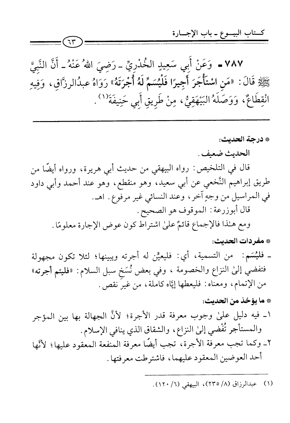 787 - وَعَنْ أَبي سَعِيدٍ الخُدْريِّ -رَضِيَ اللهُ عَنْهُ- أَنَّ النَّبِيَّ -صلى الله عليه وسلم- قالَ: "مَنِ اسْتأْجَرَ أَجِيرًا فَلْيُسَمِّ لَهُ أُجْرَتَهُ" رَوَاهُ عبدُ الرزَّاقِ، وَفِيهِ انْقِطَاعٌ، وَوَصَلَهُ البَيْهَقِيُّ، مِنْ طَرِيقِ أِبي حَنِيفَةَ (¬1).