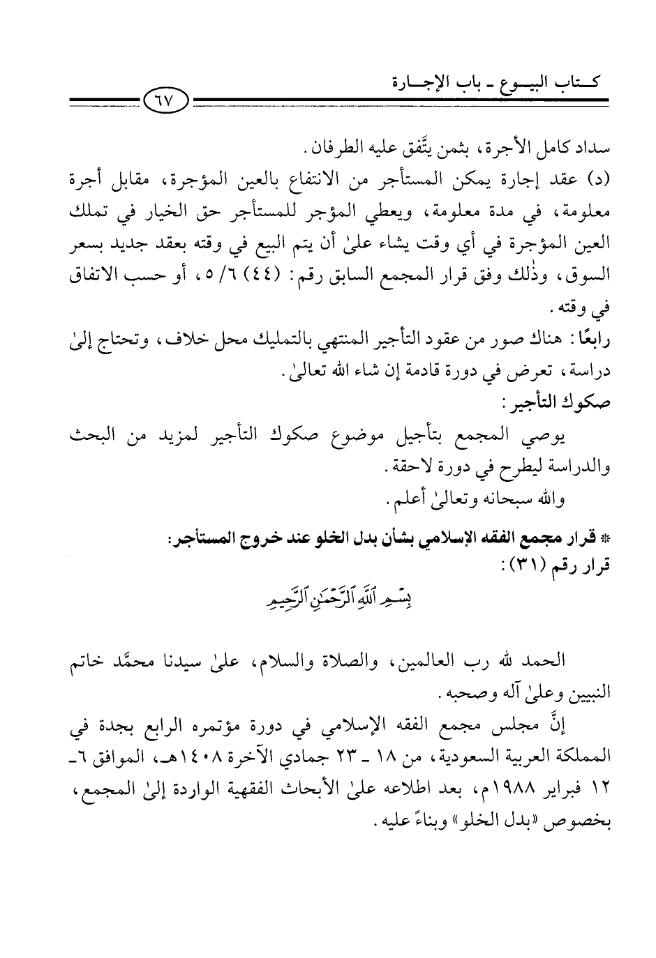 * قرار مجمع الفقه الإسلامي بشأن بدل الخلو عند خروج المستأجر: قرار رقم (31):