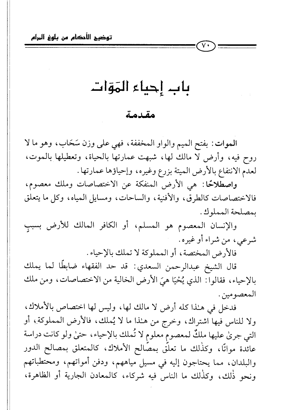 قال الشيخ عبد الرحمن السعدي: قد حد الفقهاء ضابطًا لما يملك بالإحياء، فقالوا: الذي يُحْيَا هيَ الأرض الخالية من الاختصاصات، ومن ملك المعصومين.