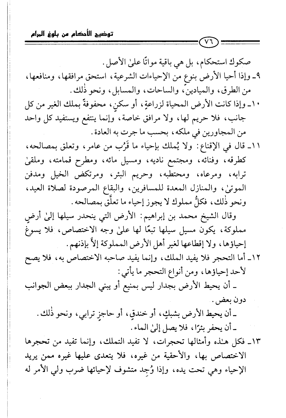 13 - فكل هذه وأمثالها تحجرات، لا تفيد التملك، وإنما تفيد من تحجرها الاختصاص بها، والأحقية من غيره، فلا يتعدى عليها غيره ممن يريد الإحياء وهي تحت يده، وإذا وُجِد متشوف لإحيائها ضرب ولي الأمر له