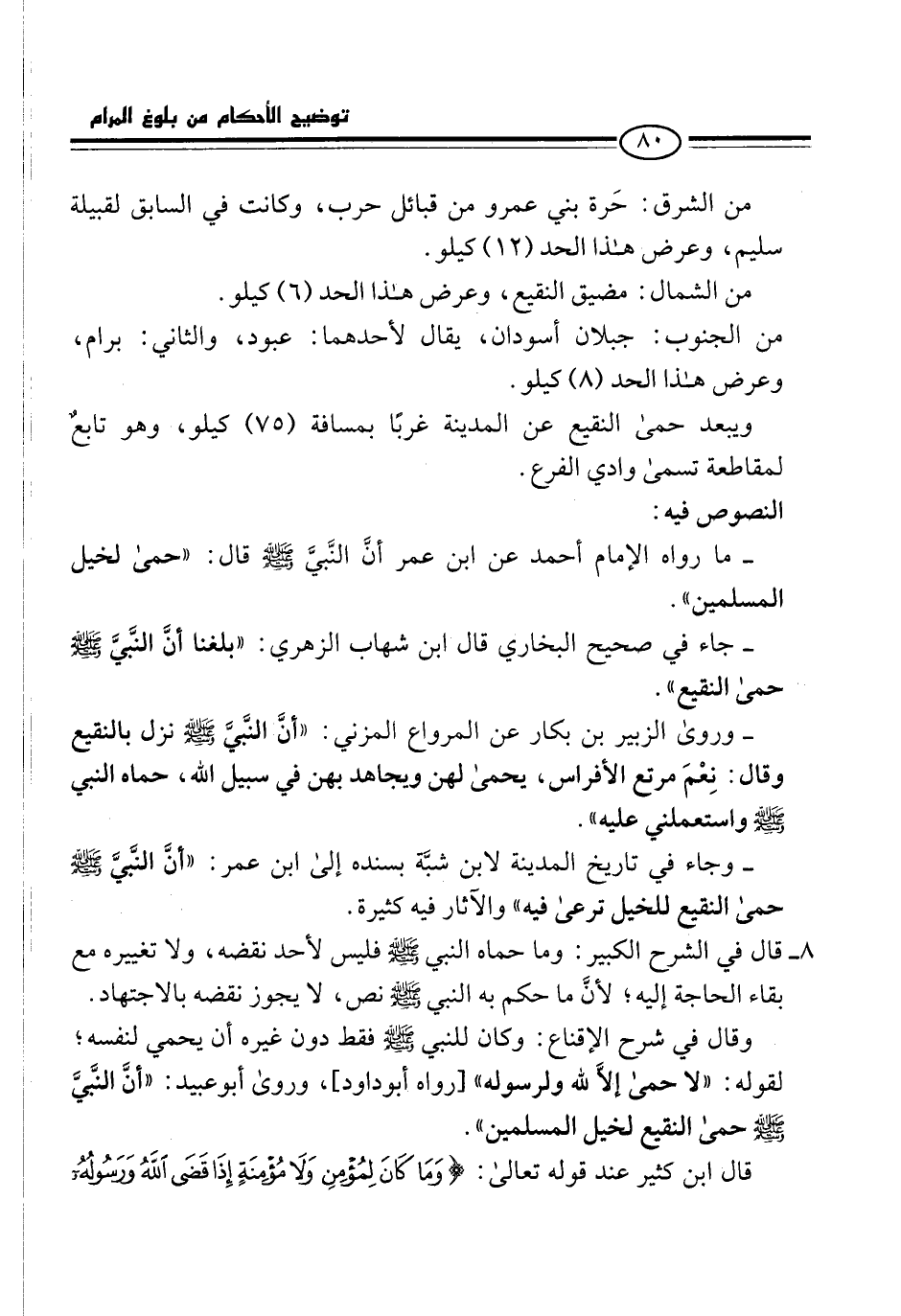 8 - قال في الشرح الكبير: وما حماه النبي -صلى الله عليه وسلم- فليس لأحد نقضه، ولا تغييره مع بقاء الحاجة إليه؛ لأنَّ ما حكم به النبي -صلى الله عليه وسلم- نص، لا يجوز نقضه بالاجتهاد.