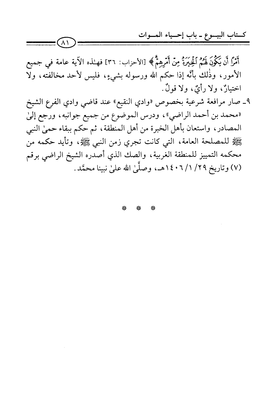 9 - صار مرافعة شرعية بخصوص "وادي النقيع" عند قاضي وادي الفرع الشيخ "محمد بن أحمد الراضي"، ودرس الموضوع من جميع جوانبه، ورجع إلى المصادر، واستعان بأهل الخبرة من أهل المنطقة، ثم حكم ببقاء حمى النبي -صلى الله عليه وسلم- للمصلحة العامة، التي كانت تجري زمن النبي -صلى الله عليه وسلم-، وتأيد حكمه من محكمه التمييز للمنطقة الغربية، والصك الذي أصدره الشيخ الراضي برقم (7) وتاريخ 29/ 1/ 1406 هـ، وصلَّى الله على نبينا محمَّد.