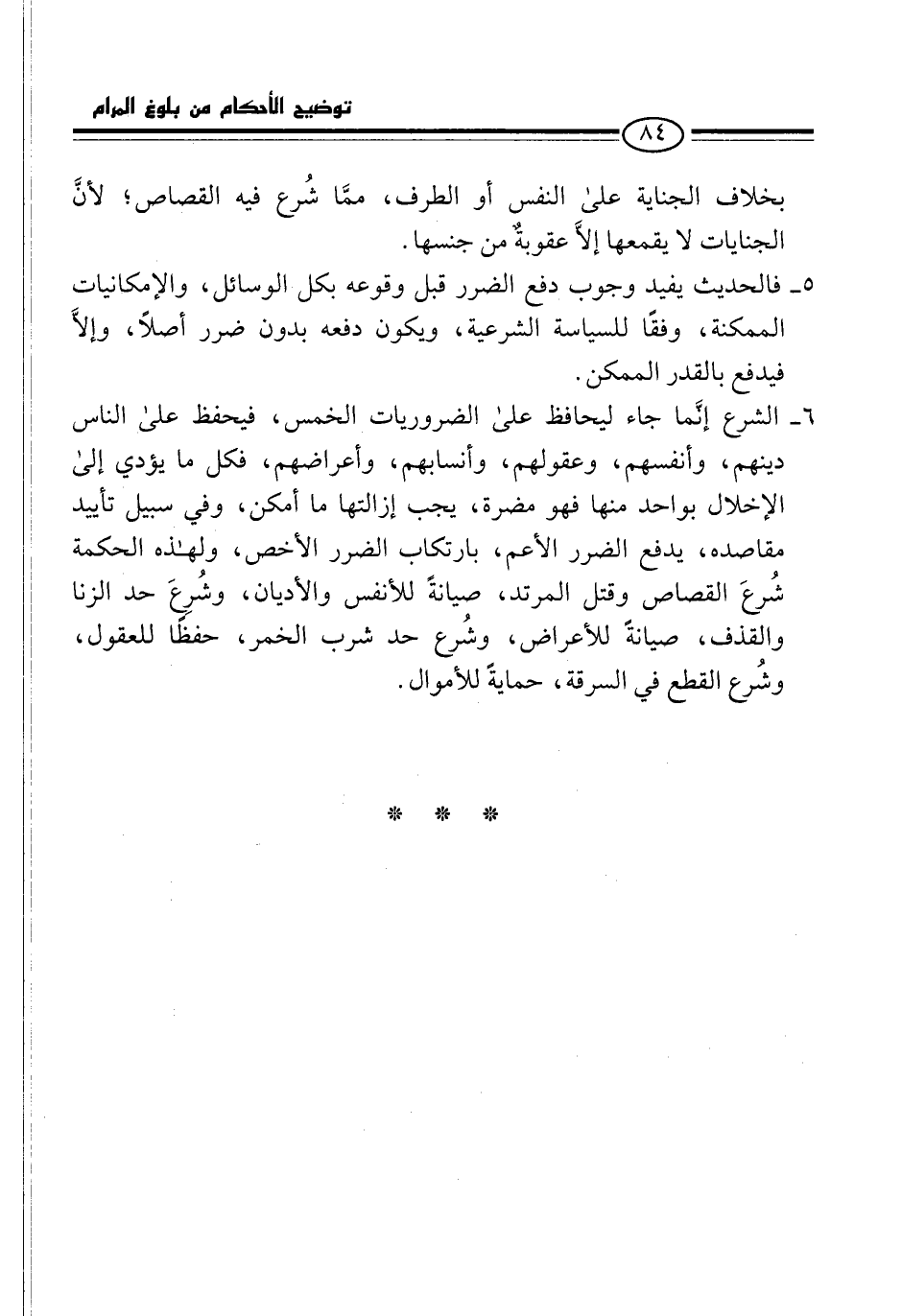 6 - الشرع إنَّما جاء ليحافظ على الضروريات الخمس، فيحفظ على الناس دينهم، وأنفسهم، وعقولهم، وأنسابهم، وأعراضهم، فكل ما يؤدي إلى الإخلال بواحد منها فهو مضرة، يجب إزالتها ما أمكن، وفي سبيل تأييد مقاصده، يدفع الضرر الأعم، بارتكاب الضرر الأخص، ولهذه الحكمة شُرعَ القصاص وقتل المرتد، صيانةً للأنفس والأديان، وشُرعَ حد الزنا والقذف، صيانةً للأعراض، وشُرع حد شرب الخمر، حفظًا للعقول، وشُرع القطع في السرقة، حمايةً للأموال.