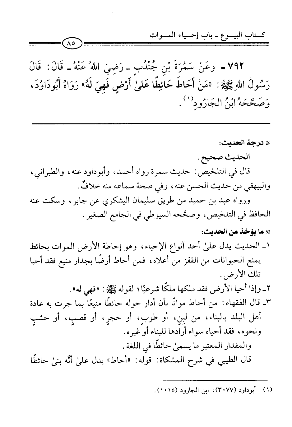 792 - وعَنْ سَمُرَةَ بْنِ جُنْدُبٍ -رَضِيَ اللهُ عَنْهُ- قَالَ: قَالَ رَسُولُ اللهِ -صلى الله عليه وسلم-: "مَنْ أَحَاطَ حَائِطًا عَلى أَرْضٍ فَهِيَ لَهُ" رَوَاهُ أَبُو دَاوُدَ، وَصَحَّحَهُ ابْنُ الجَارُودِ (¬1).