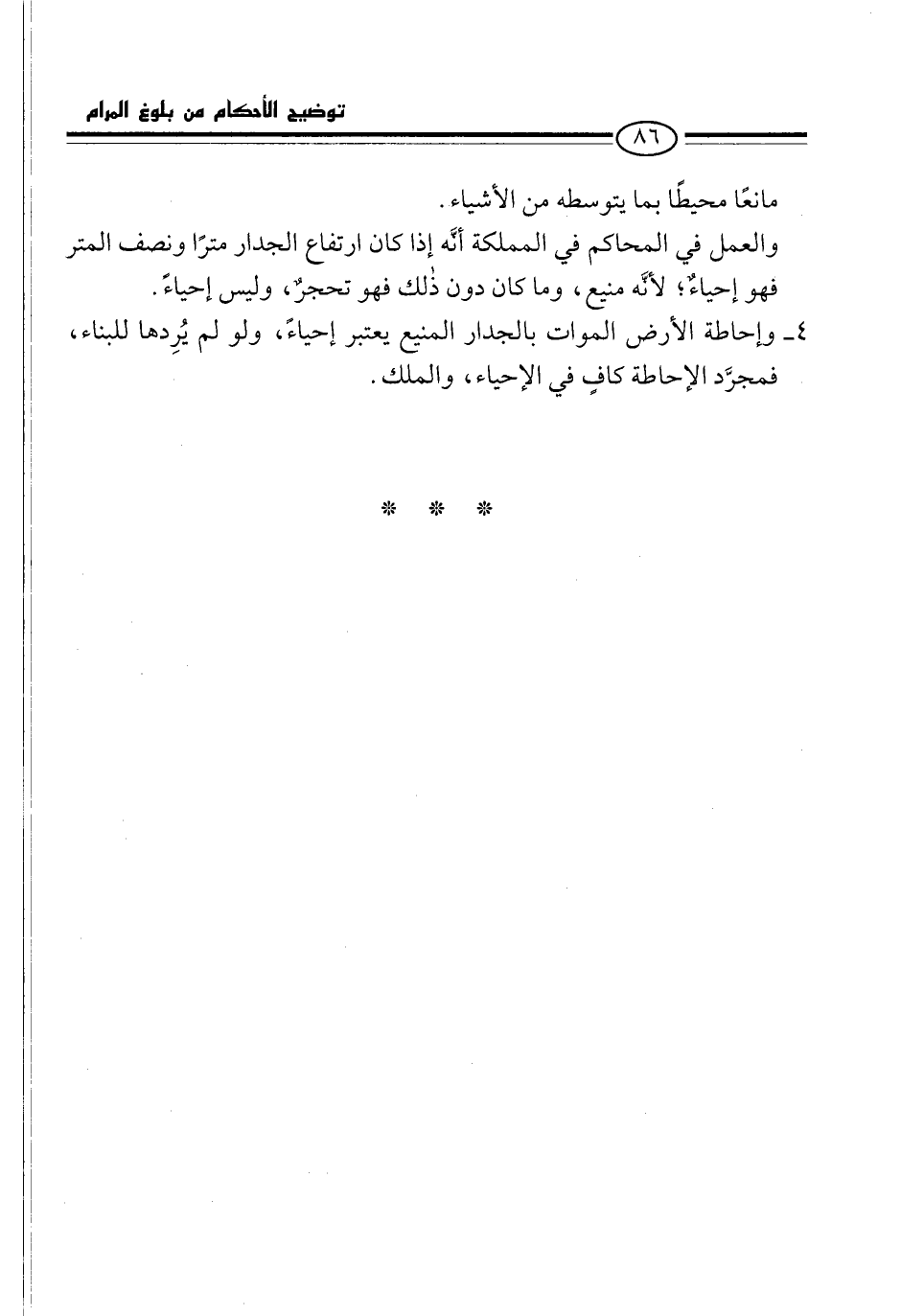 4 - وإحاطة الأرض الموات بالجدار المنيع يعتبر إحياءً، ولو لم يُرِدها للبناء، فمجرَّد الإحاطة كافٍ في الإحياء، والملك.