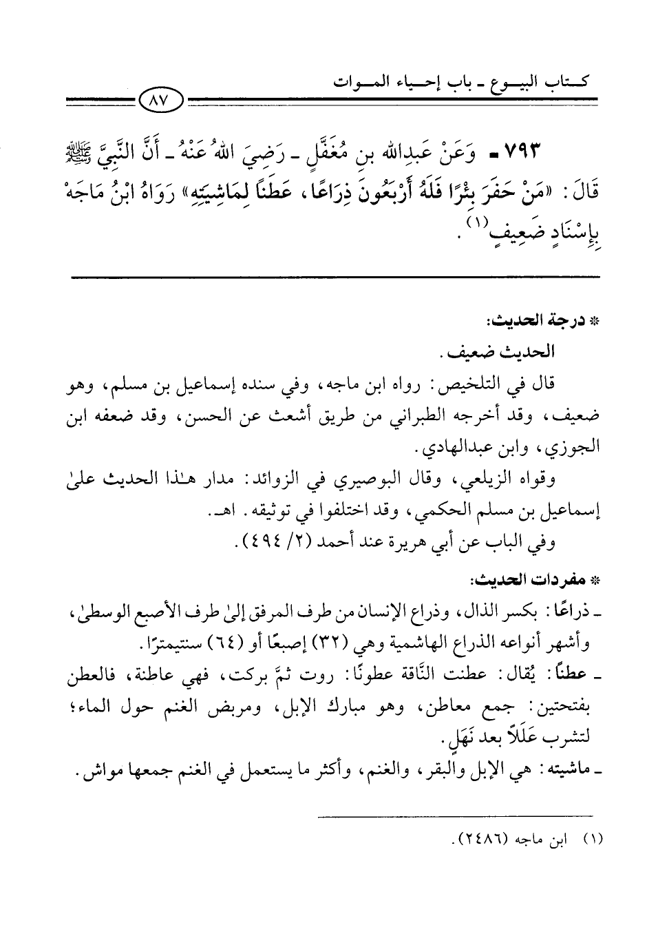 793 - وَعَنْ عَبدِ الله بنِ مُغَفَّلٍ -رَضِيَ اللهُ عَنْهُ- أَنَّ النَّبِيَّ -صلى الله عليه وسلم- قَالَ: "مَنْ حَفَرَ بئْرًا فَلَهُ أَرْبَعُونَ ذِرَاعًا، عَطَنًا لِمَاشِيتَهِ" رَوَاهُ ابْنُ مَاجَهْ بِإِسْنَادٍ ضَعِيفٍ (¬1).