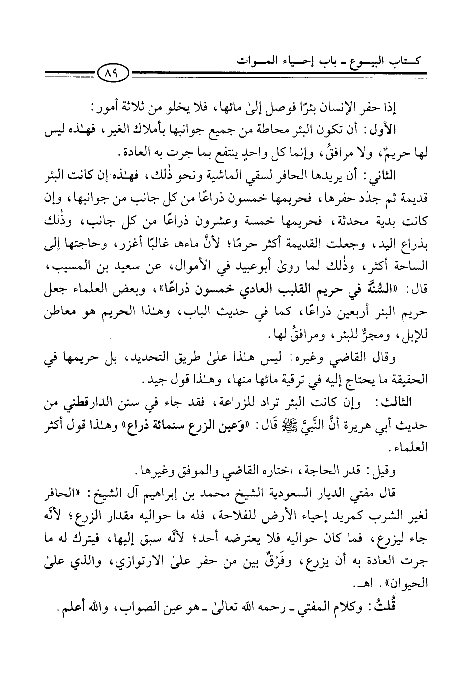 قال مفتي الديار السعودية الشيخ محمد بن إبراهيم آل الشيخ: "الحافر لغير الشرب كمريد إحياء الأرض للفلاحة، فله ما حواليه مقدار الزرع؛ لأنَّه جاء ليزرع، فما كان حواليه فلا يعترضه أحد؛ لأنَّه سبق إليها، فيترك له ما جرت العادة به أن يزرع، وفَرْقٌ بين من حفر على الارتوازي، والذي على الحيوان". اهـ.