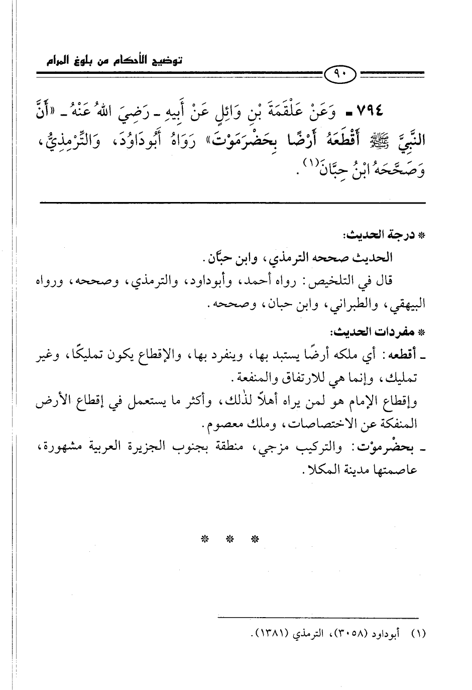 794 - وَعَنْ عَلْقَمَةَ بْنِ وَائِلٍ عَنْ أَبِيهِ -رَضِيَ اللهُ عَنْهُ- "أَنَّ النَّبِيَّ -صلى الله عليه وسلم- أَقْطَعَهُ أَرْضًا بِحَضْرَمَوْتَ" رَوَاهُ أَبُو دَاوُدَ، وَالتِّرْمِذِيُّ، وَصَحَّحَهُ ابْنُ حِبَّانَ (¬1).