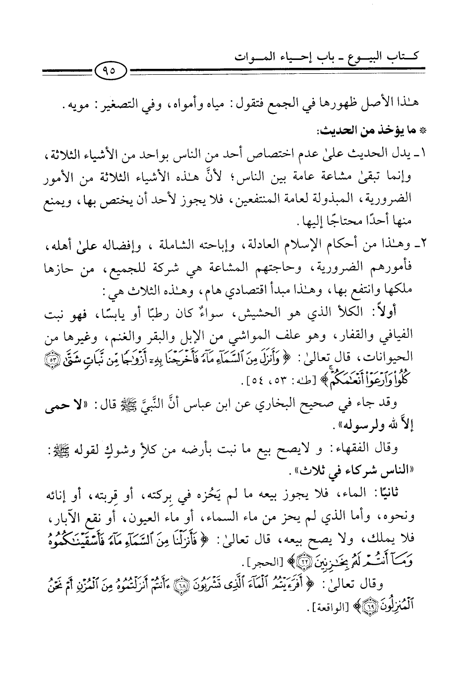 2 - وهذا من أحكام الإسلام العادلة، وإباحته الشاملة، وإفضاله على أهله، فأمورهم الضرورية، وحاجتهم المشاعة هي شركة للجميع، من حازها ملكها وانتفع بها، وهذا مبدأ اقتصادي هام، وهذه الثلاث هي: